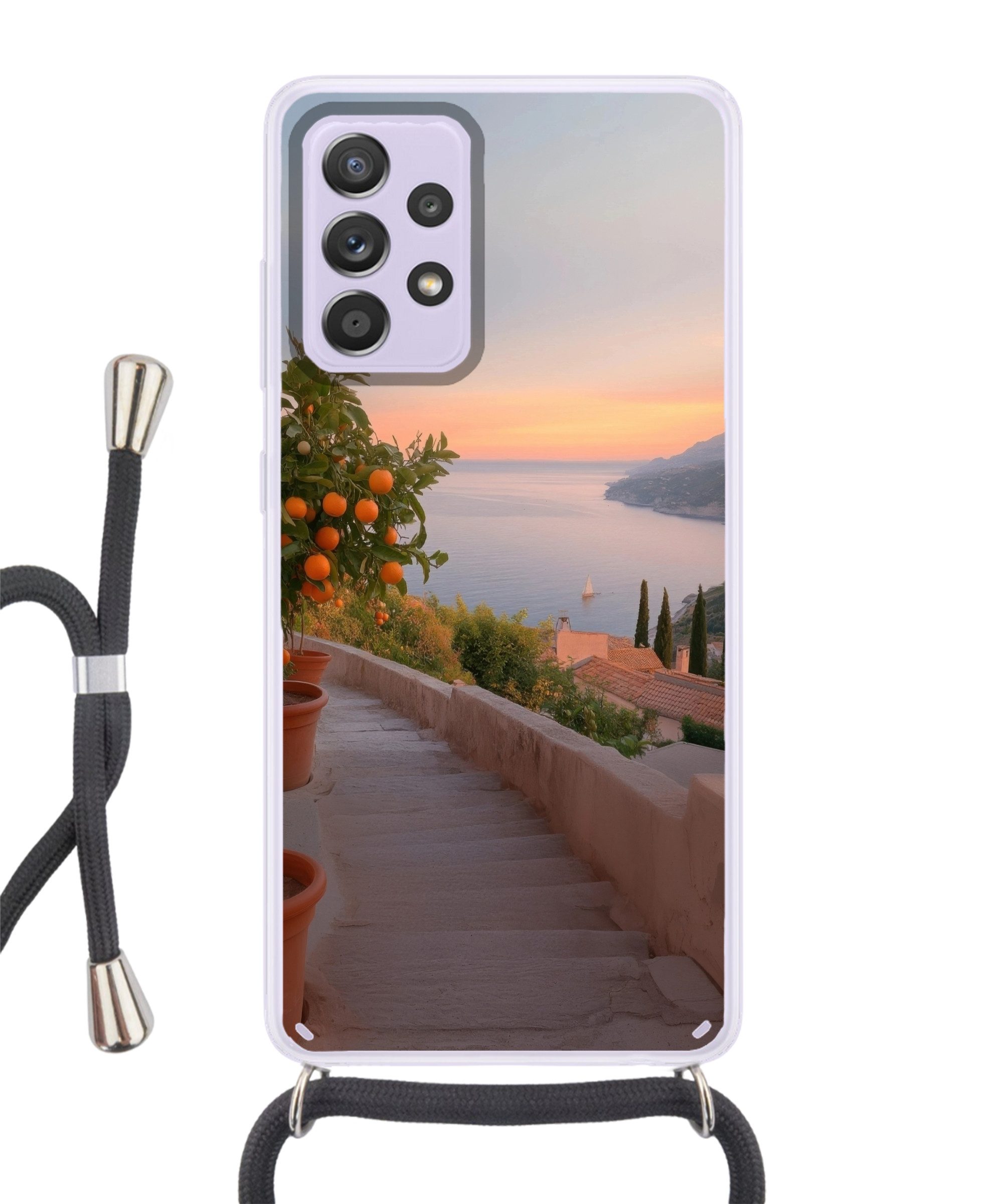 Ein malerischer Weg schlängelt sich an einer Terrasse mit blühenden Orangenbäumen vorbei, während die Sonne ein warmes Licht auf das Mittelmeer wirft. In der Ferne segelt ein Segelboot friedlich über das ruhige Wasser, umgeben von Zypressenhügeln und idyllischen Dächern. Der Himmel färbt sich in zartes Rosa und Orange, ein perfekter Abschluss für einen mediterranen Tag.