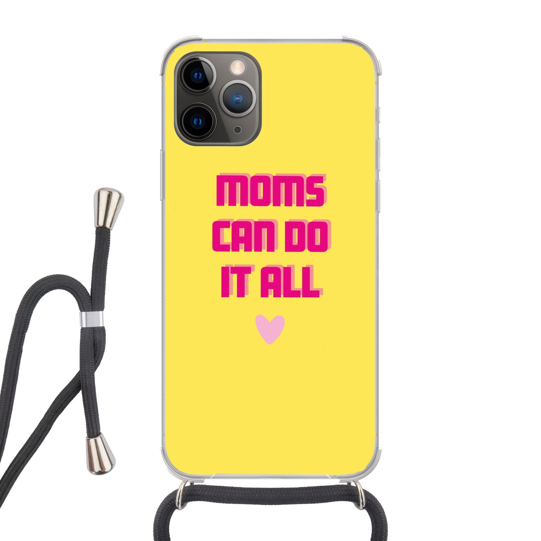 Ein leuchtend gelber Hintergrund mit fetten rosa Großbuchstaben, die "Moms can do it all" lautet. Der Text hat einen Schatteneffekt, und es gibt ein kleines rosa Herz unter den Worten, Hervorhebung der Stärke und Vielseitigkeit der Mütter.