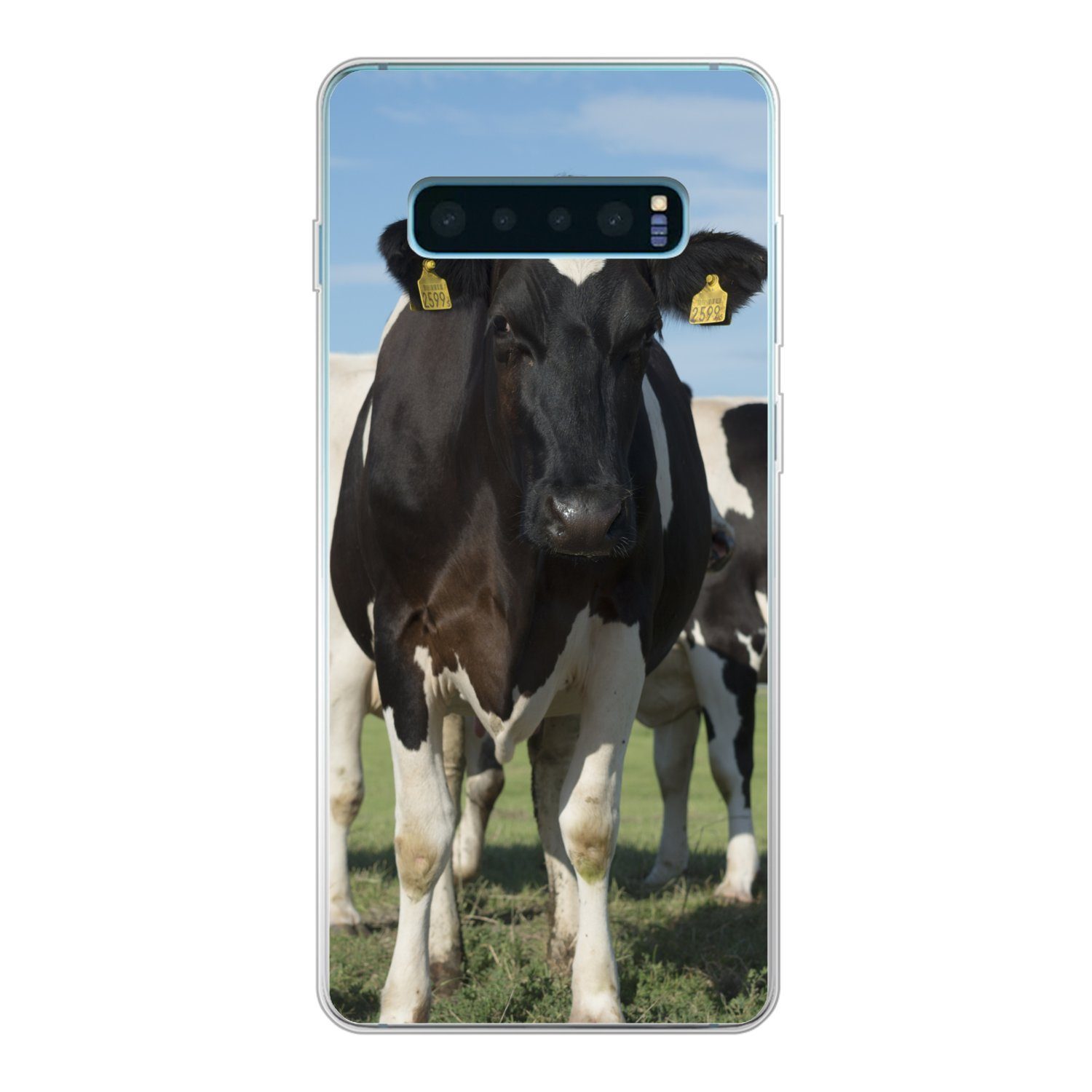 Drei Friesenkühe stehen in einer grünen Landschaft mit einem blauen Himmel im Hintergrund.Kompatible Geräte | Samsung Galaxy S10 Lite |