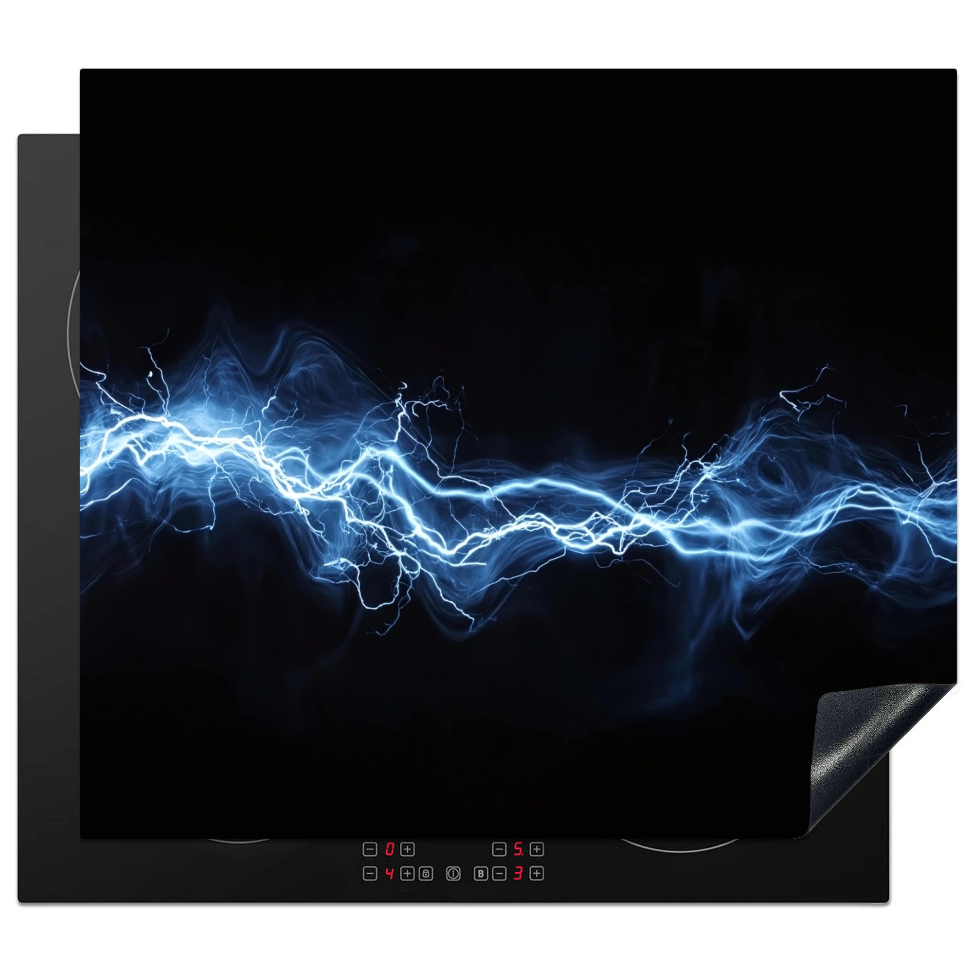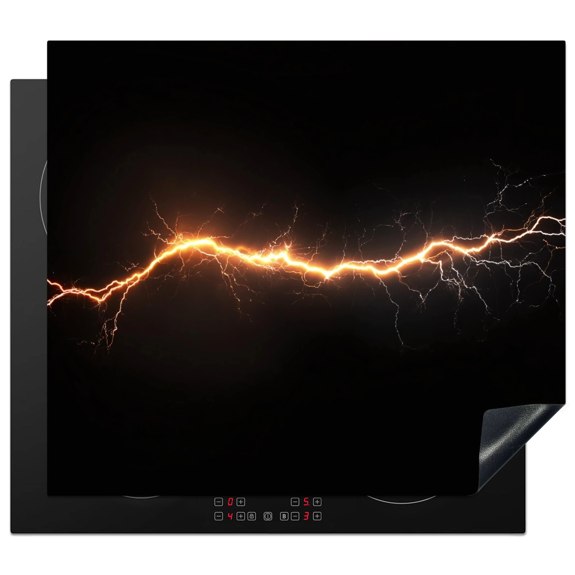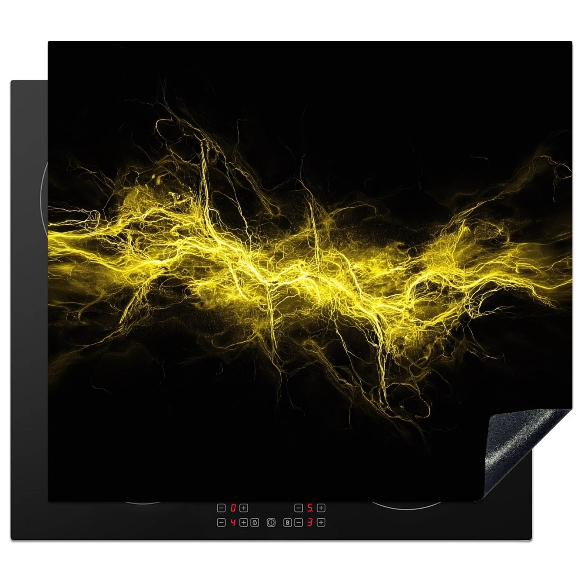 In der Mitte bewegt sich eine leuchtend gelbe Stromwolke vor einem schwarzen Hintergrund mit wirbelnder Energie.