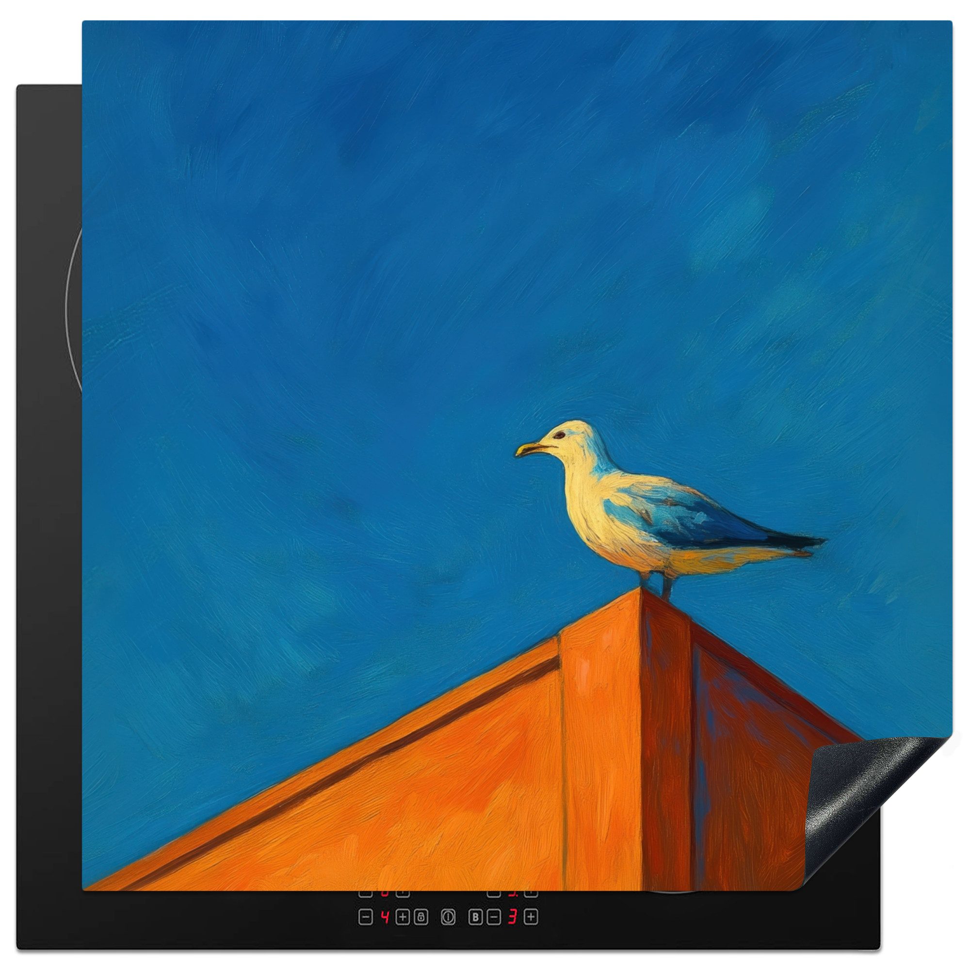 Eine weiße Möwe mit blauen Akzenten sitzt auf der Spitze eines orangefarbenen Gebäudes. Der Himmel im Hintergrund ist tiefblau und mit weichen Pinselstrichen gemalt.