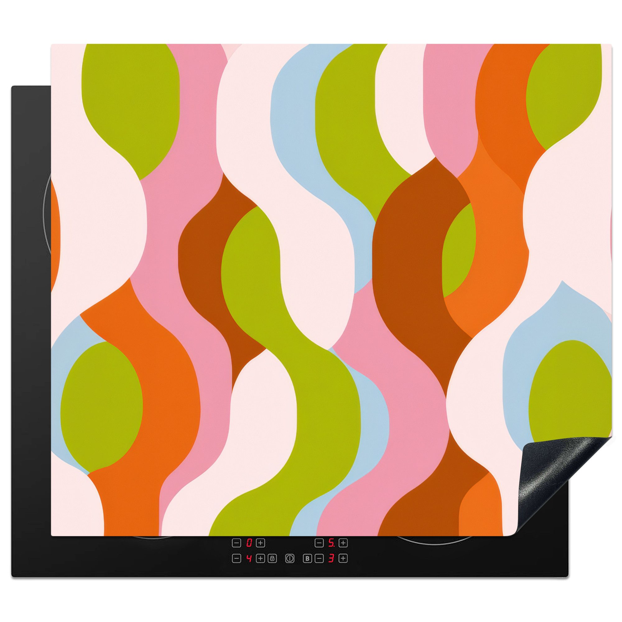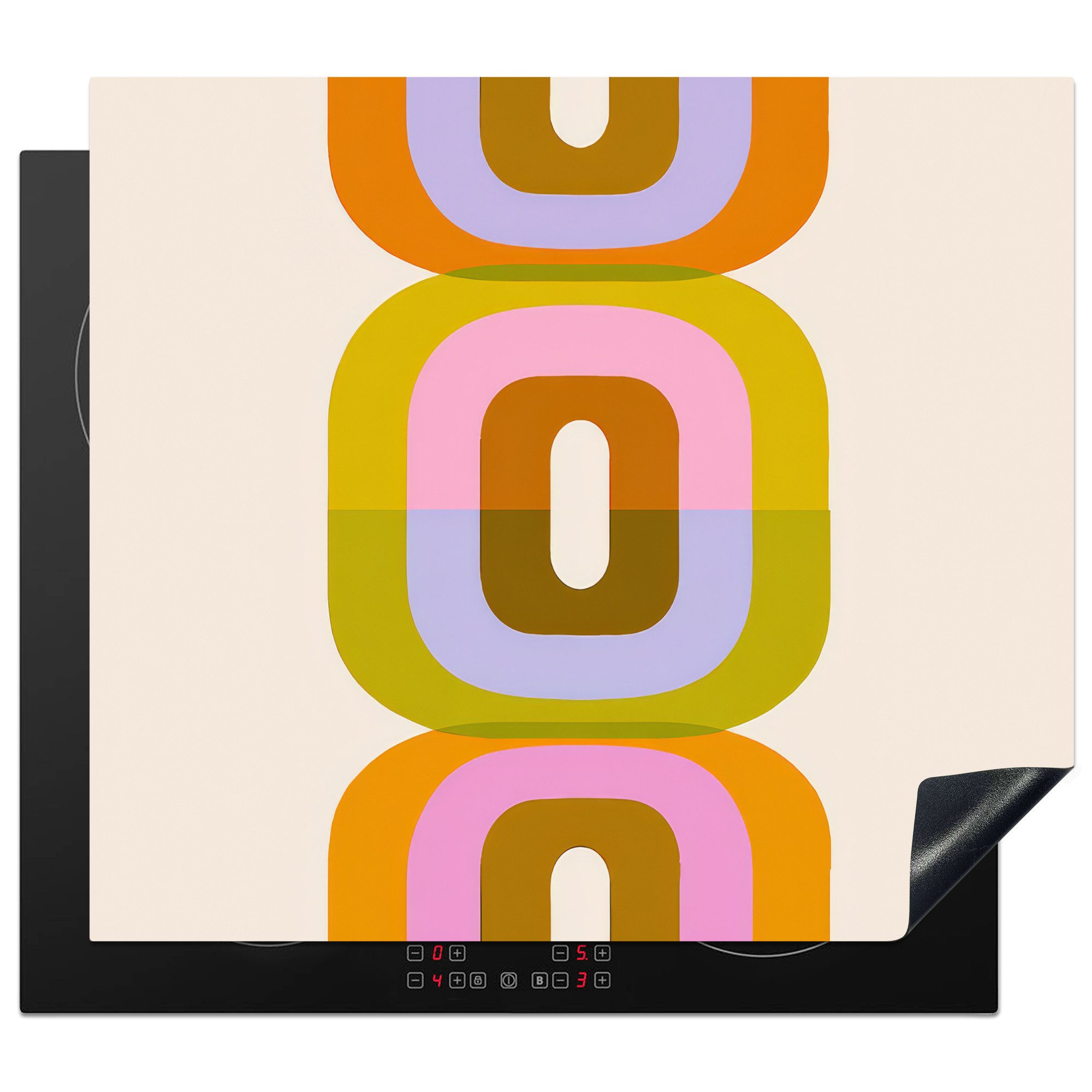 Ovale Blockformen in Orange, Rosa, Lila und Gelb sind vertikal auf einem beigen Hintergrund gestapelt. Die Überlappung schafft Tiefe und Wiederholung.