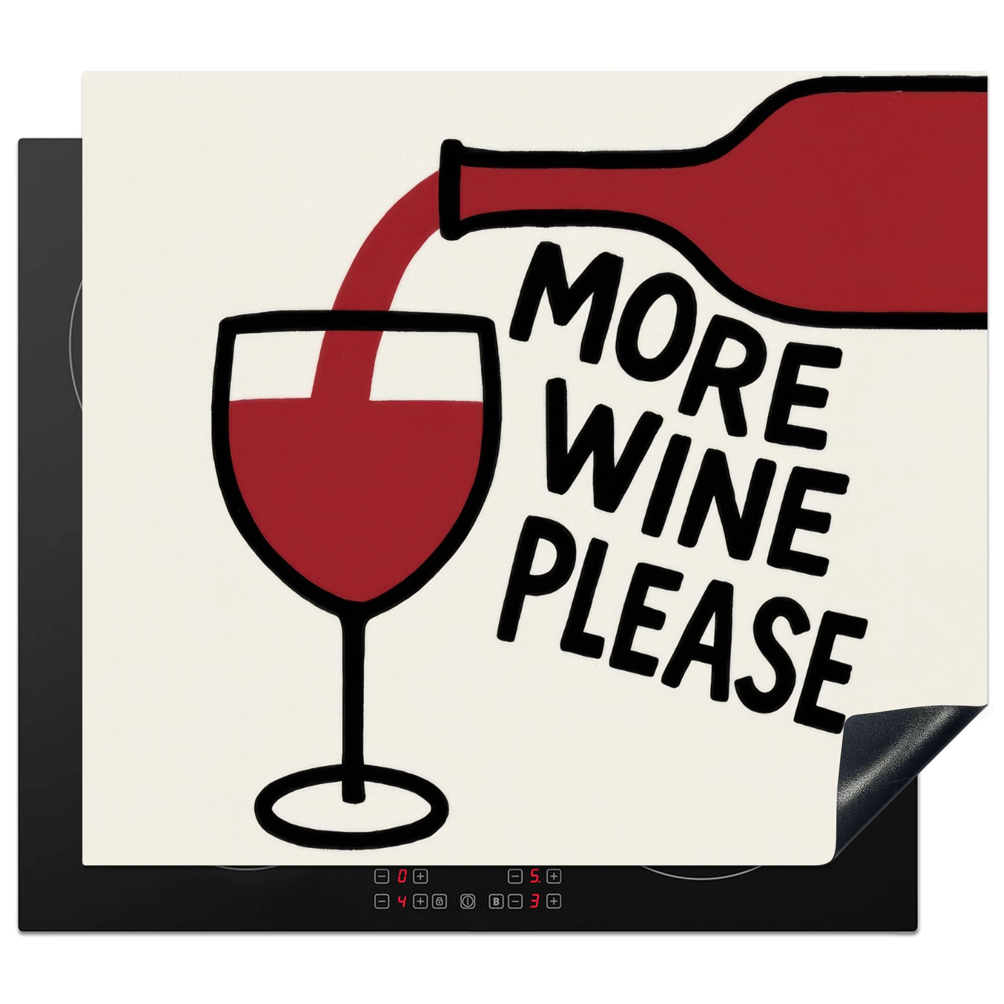 Eine dunkelrote Weinflasche schenkt Wein in ein Glas ein. Schräg daneben steht in schwarzen Buchstaben der Text "MORE WINE PLEASE".