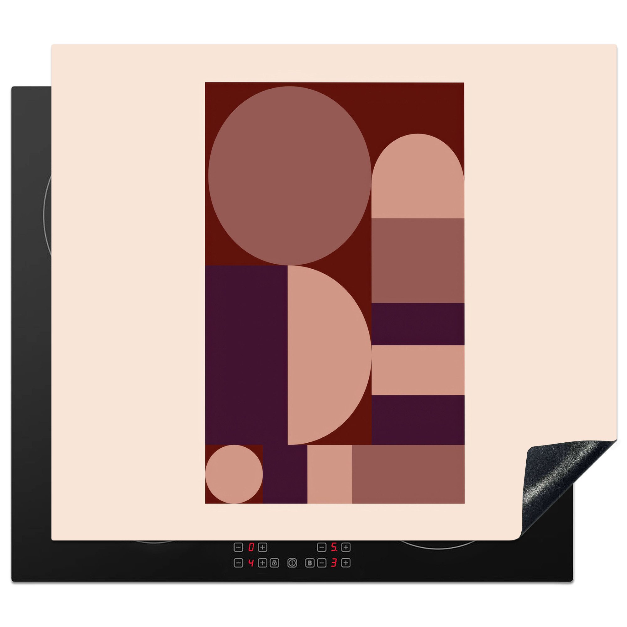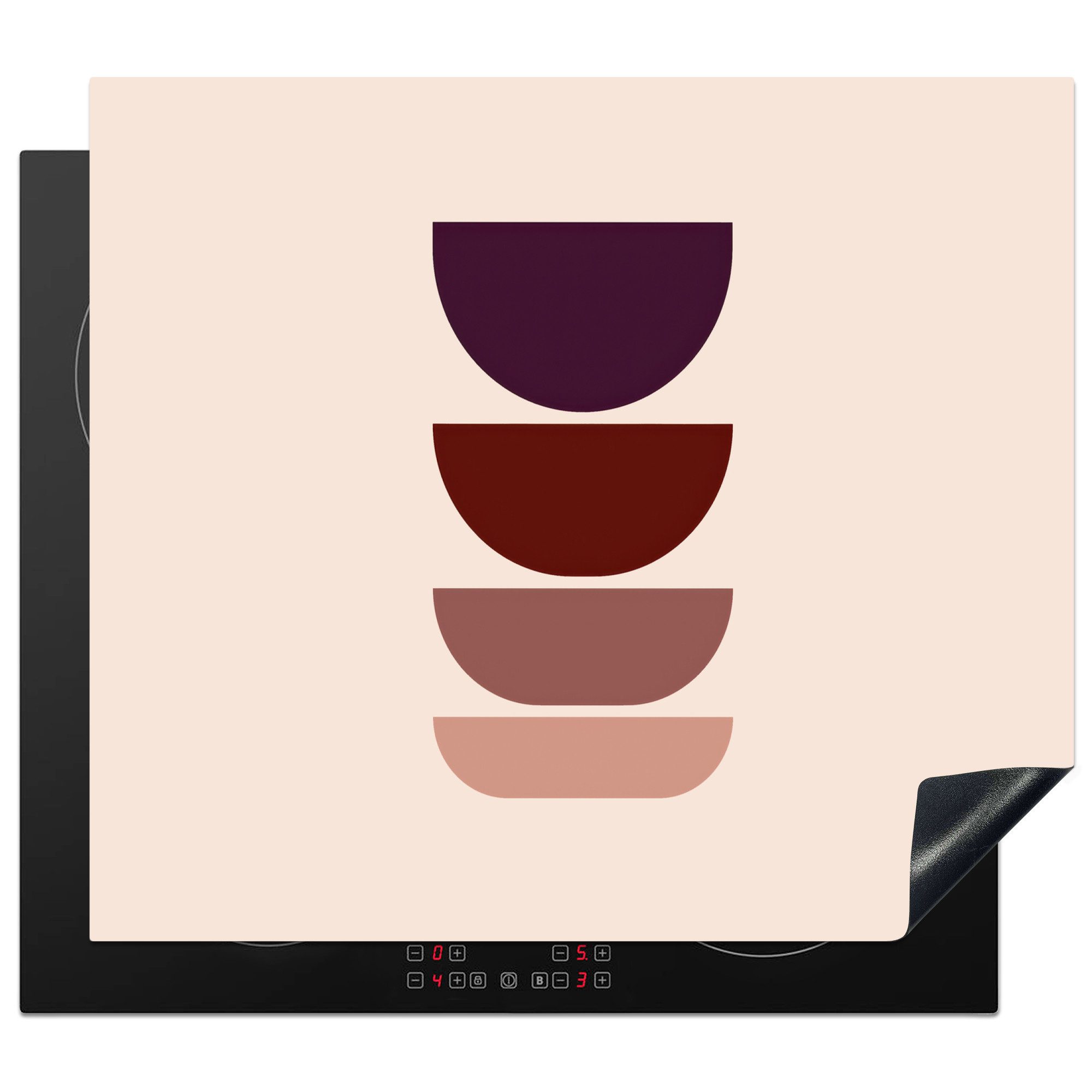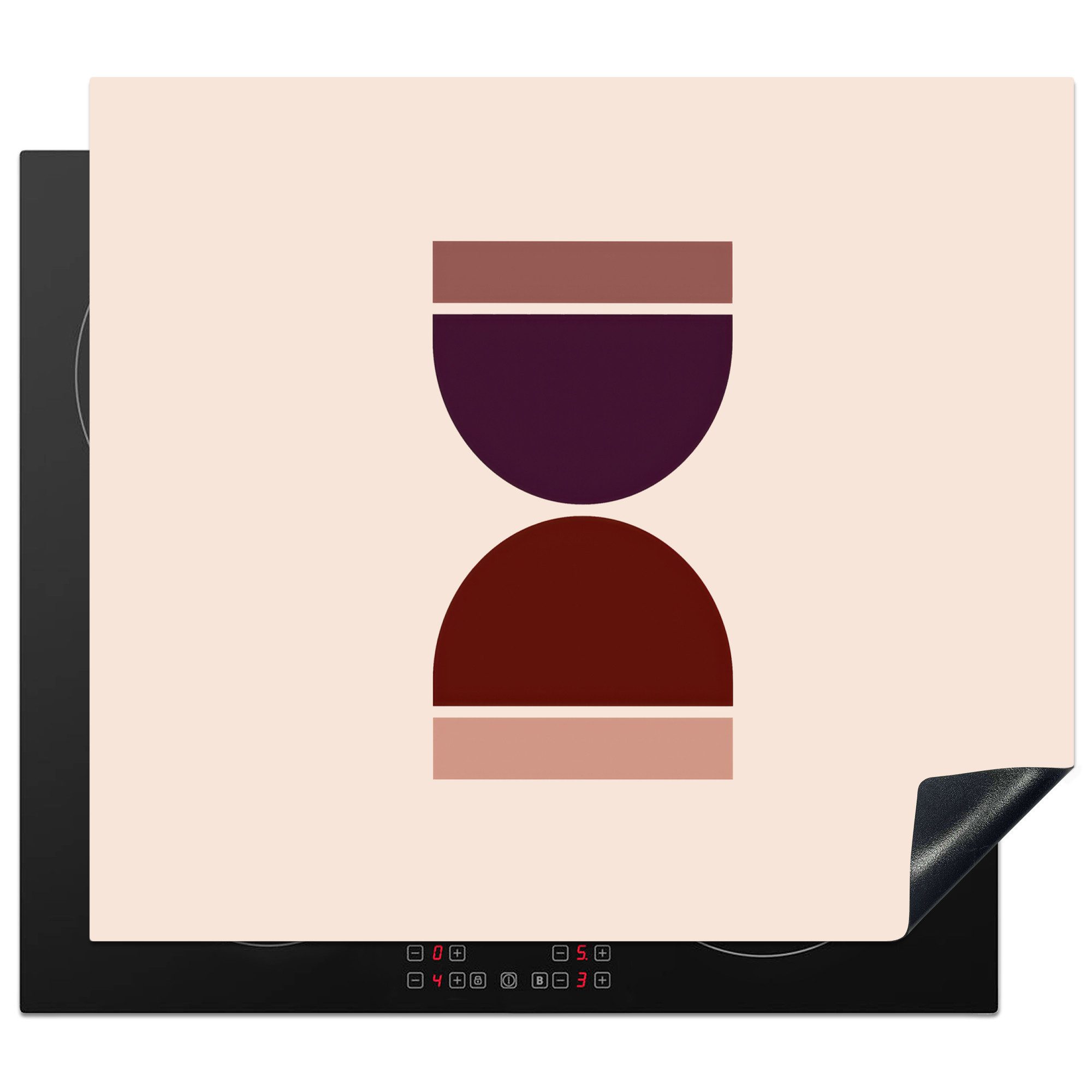 Zwei Halbkreise in Bordeaux und Aubergine stehen sich gegenüber, getrennt durch horizontale Balken in zarten Rosatönen. Die symmetrische Komposition auf einem blassrosa Hintergrund erinnert an eine abstrakte Sanduhr- oder Vasenform.