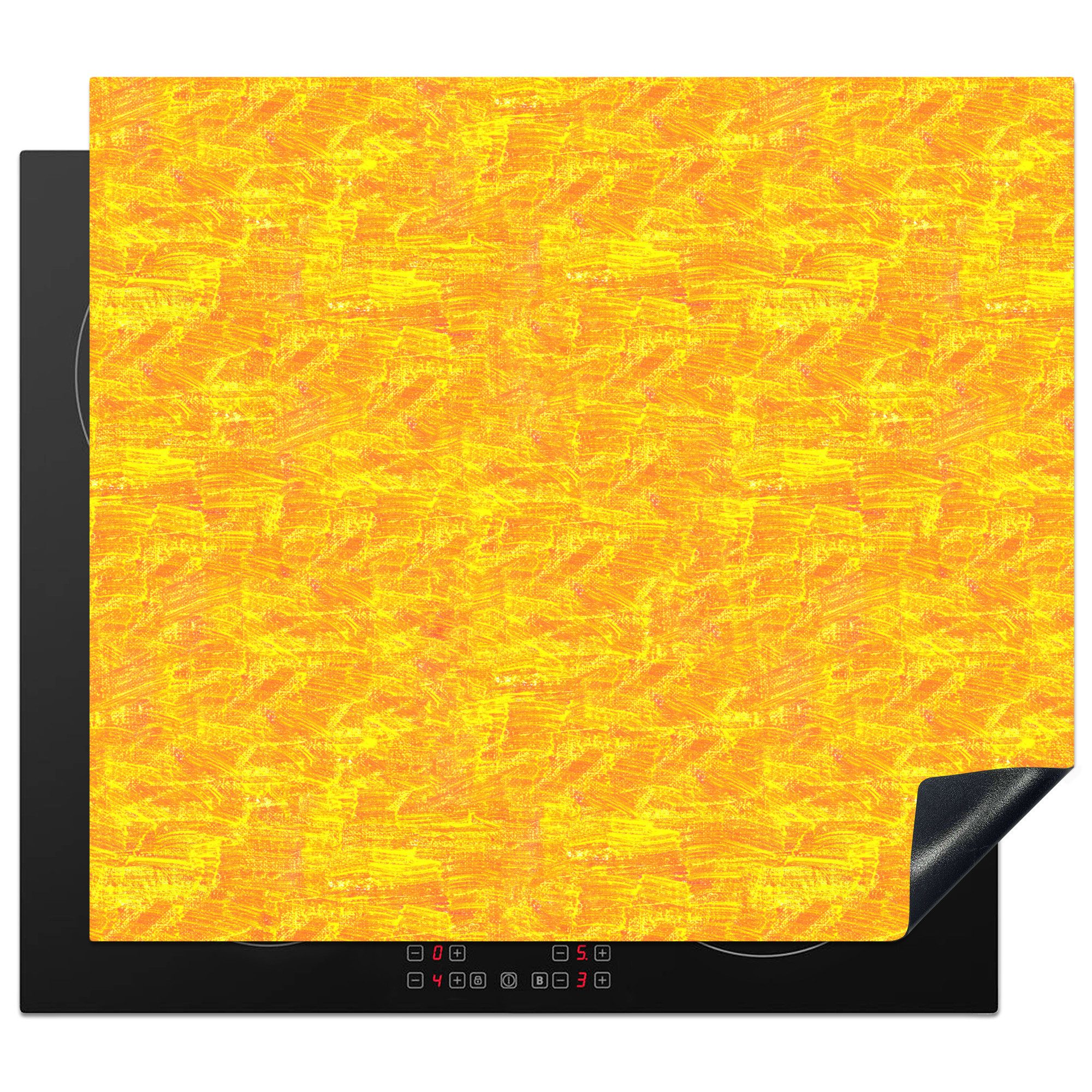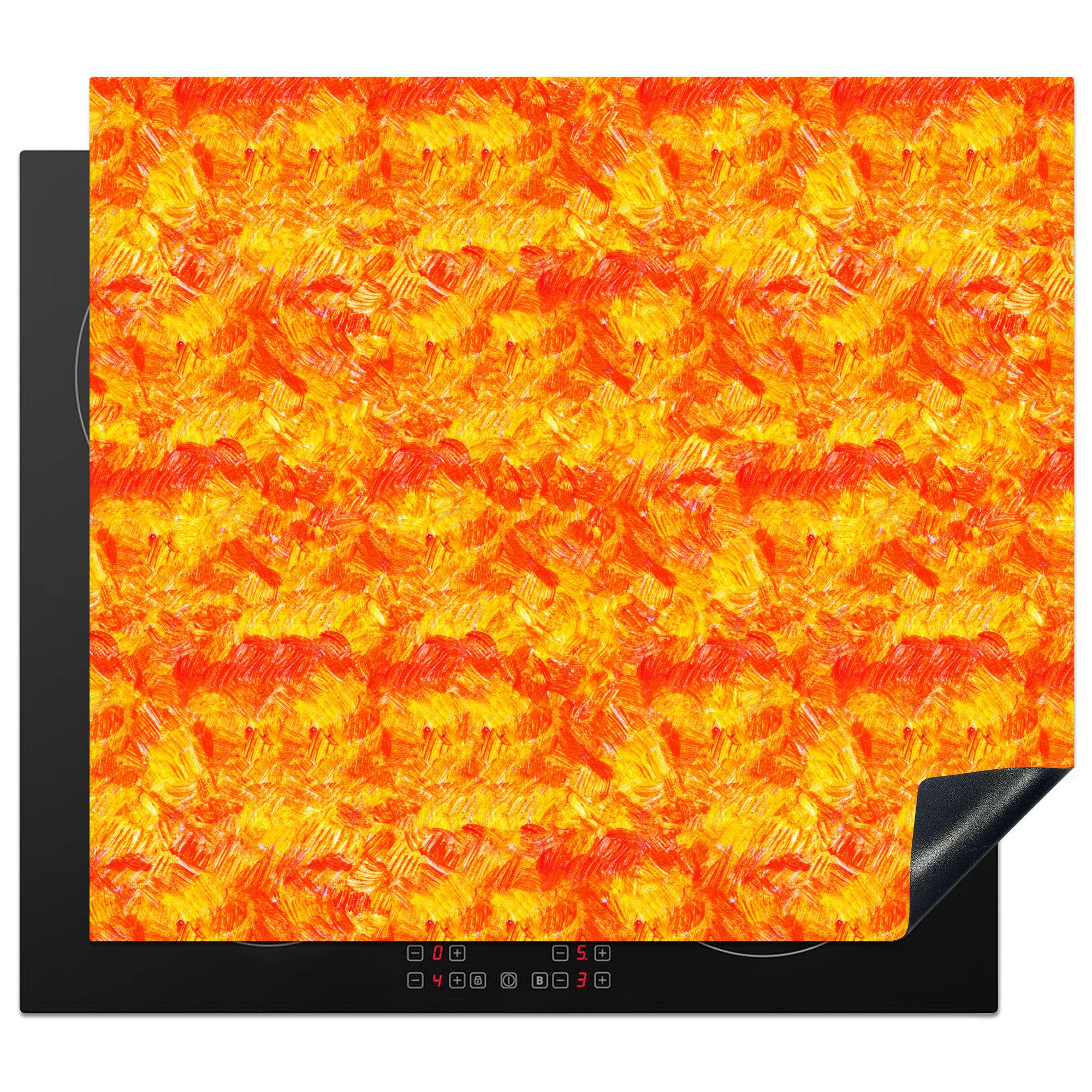Feuriges Muster aus kurzen, geschwungenen Pinselstrichen in leuchtendem Gelb, Orange und Rot. Die Farbe wird energisch aufgetragen und überlagert sich in Schichten, wodurch ein intensiver Rhythmus von Licht und Hitze entsteht. Die Komposition erinnert an Sonneneruptionen oder glühende Hitze.