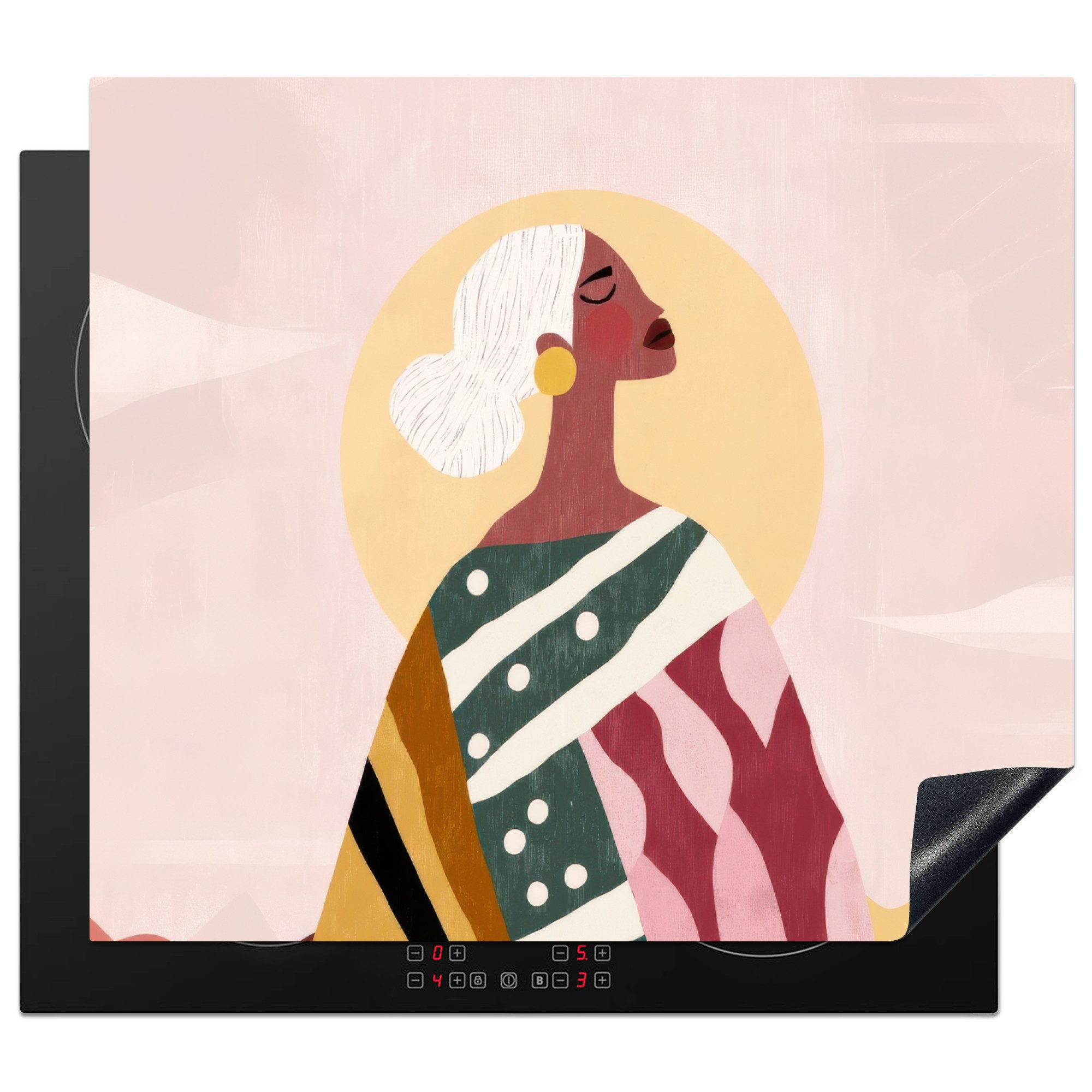 Abstraktes Bild einer Frau mit weißem Haar und goldenem Ohrring, gekleidet in ein buntes Gewand, mit einer goldenen Sonne hinter ihrem Kopf.