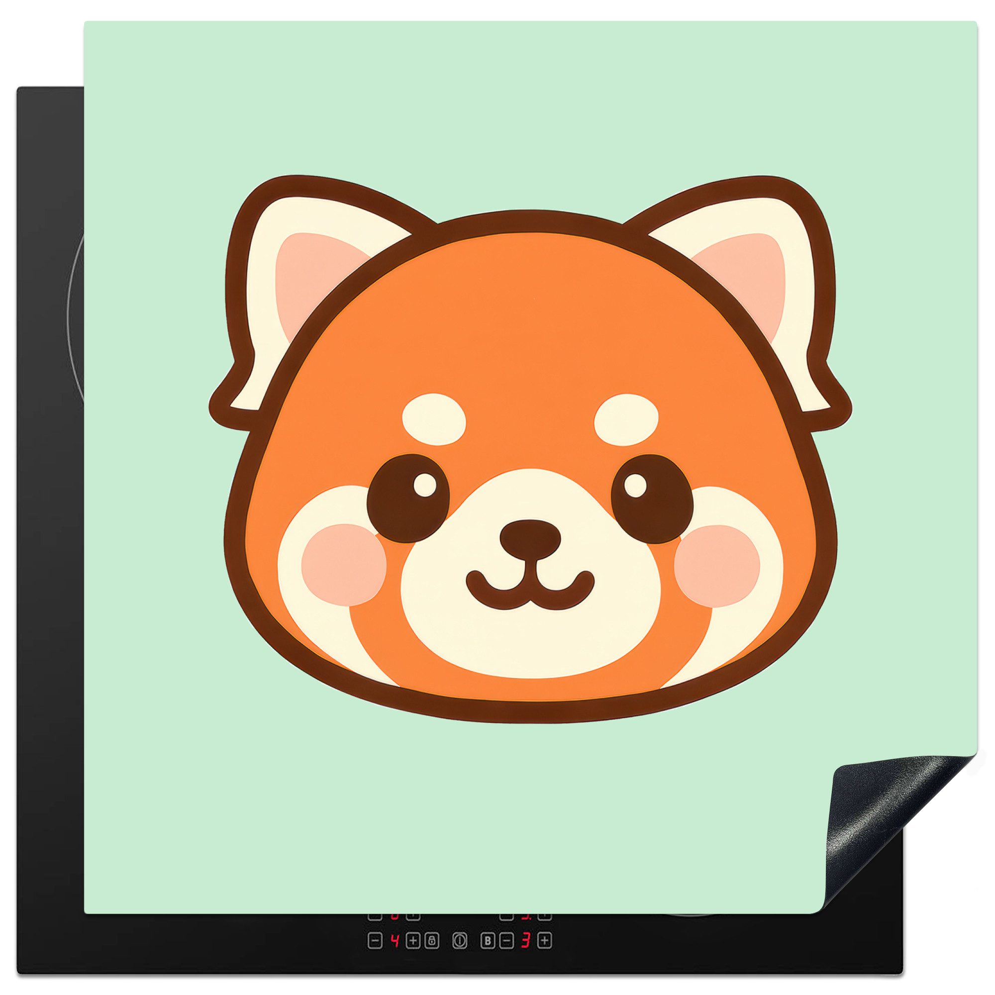 Ein abgerundetes Gesicht eines roten Pandas mit großen Augen, rosa Wangen und einem freundlichen Lächeln ist vor einem hellgrünen Hintergrund abgebildet. Der Stil ist weich und cartoonhaft.