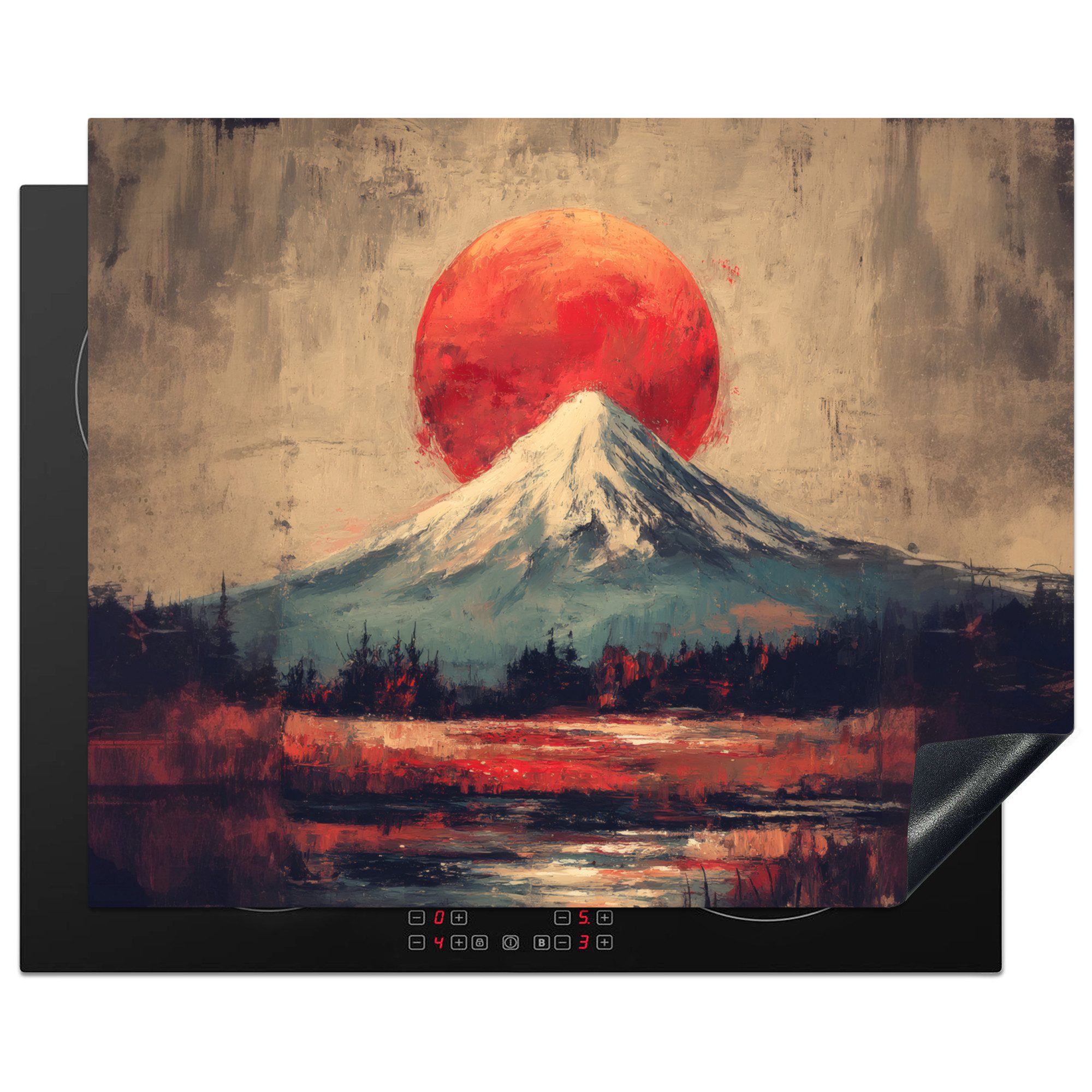 Ein schneebedeckter Berggipfel erhebt sich vor einer feuerroten Sonne, die sich in einer stillen Wasseroberfläche spiegelt.