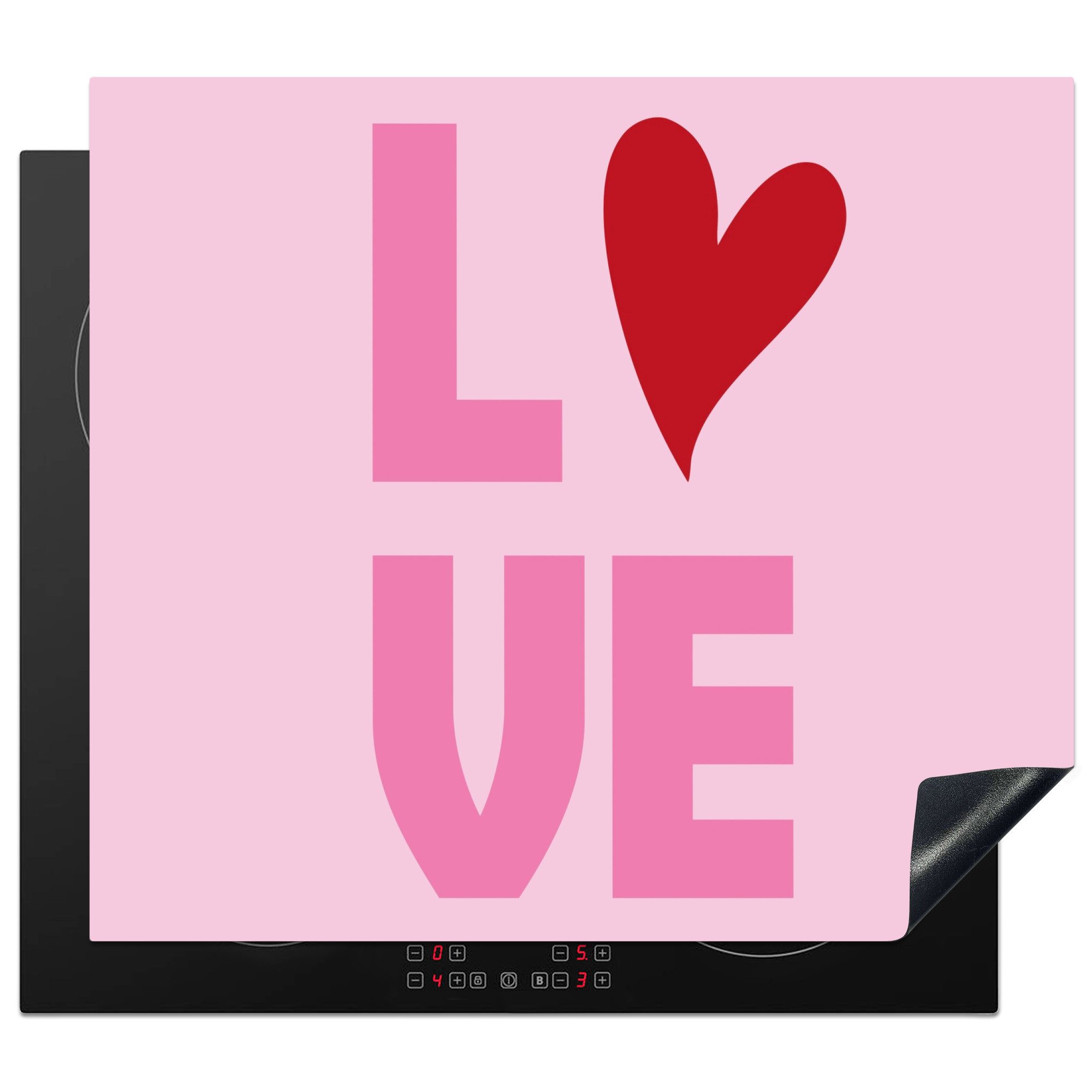 Ein blassrosa Hintergrund mit den Buchstaben "L" und "VE" in großen, rosafarbenen Blockbuchstaben. Das "O" wird durch ein rotes Herz ersetzt, das die Komposition vervollständigt. Ein minimalistisches und grafisches Design, das direkt die Essenz der Liebe vermittelt.Farbe | Text - Love |