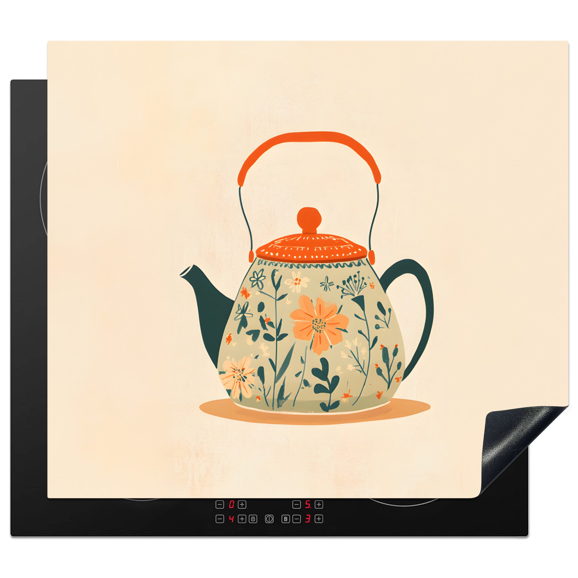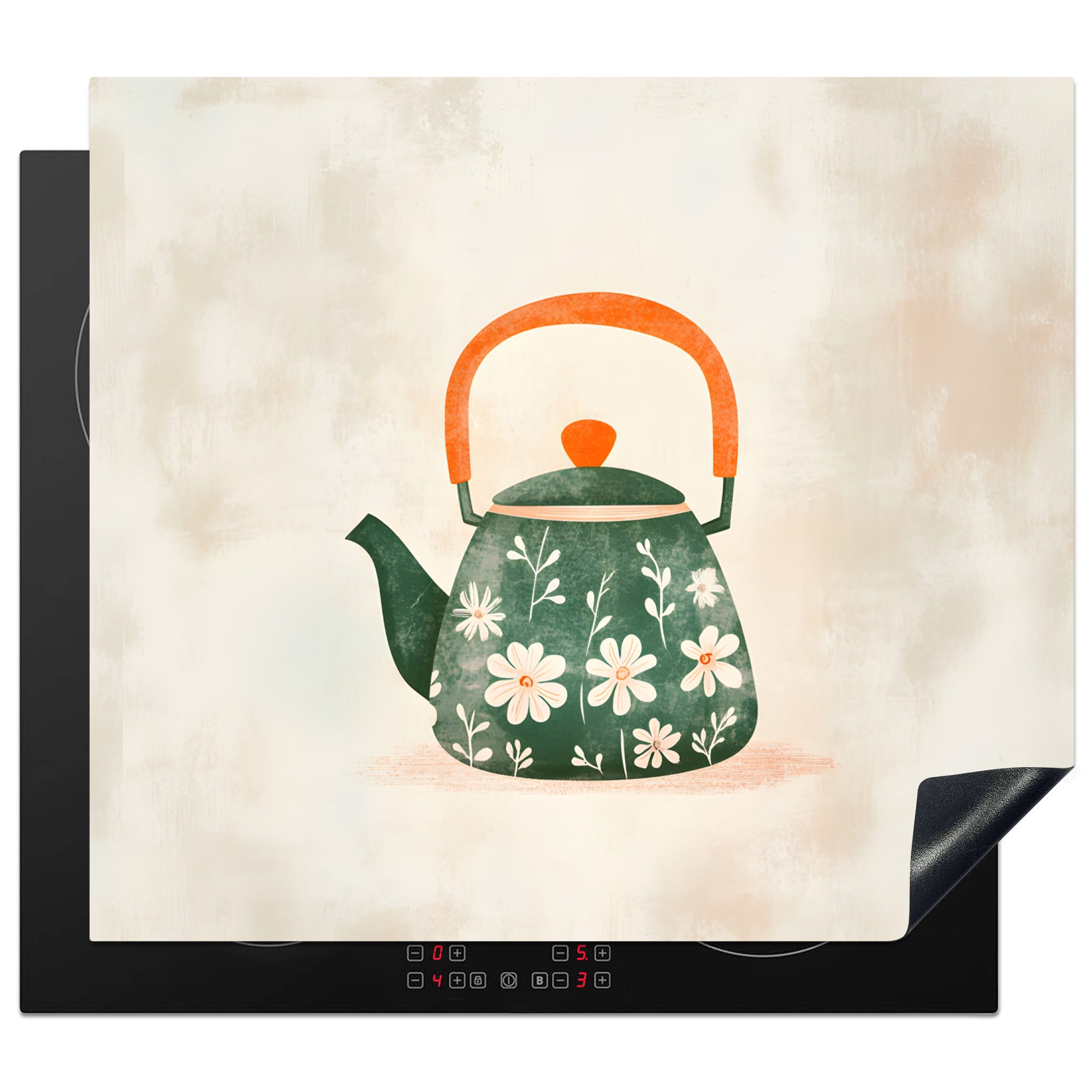 Ein grüner Teekessel mit orangefarbenem Griff ist mit weißen Blumen und zarten Zweigen vor einem strukturierten Hintergrund verziert.