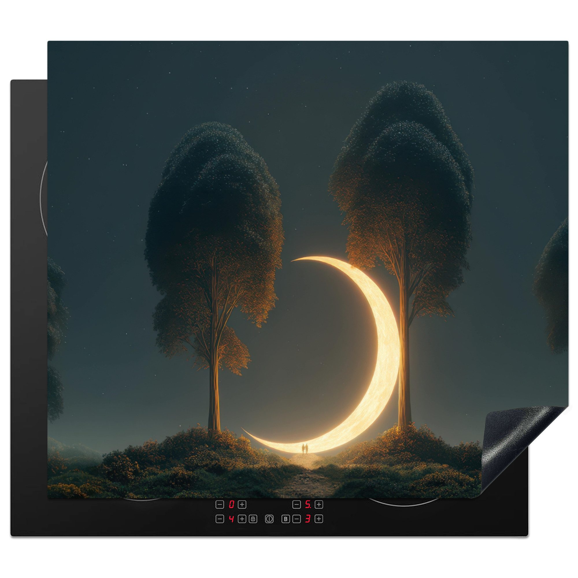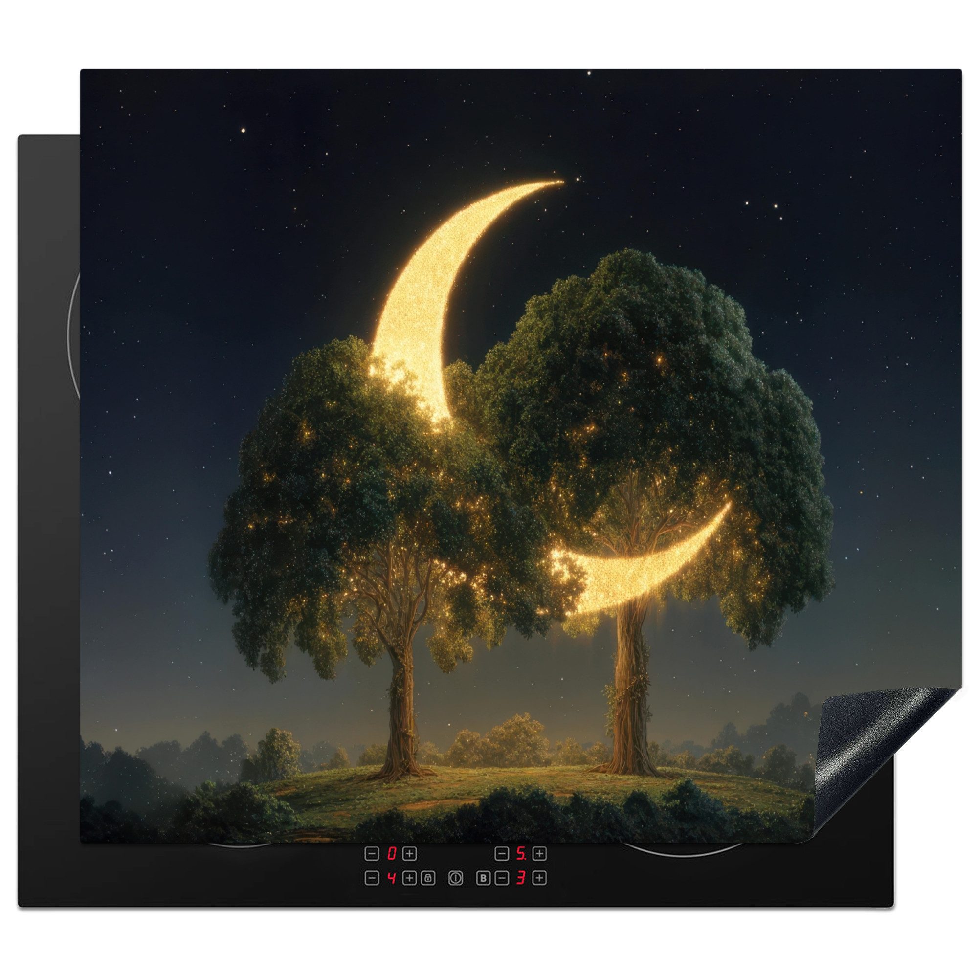 Zwei große Bäume stehen auf einer Hügelkuppe unter einem Sternenhimmel. Zwischen ihren Wipfeln hängt eine glitzernde, goldene Mondsichel, die sich wie ein leuchtendes Kunstwerk in die Baumkronen schmiegt. Die Szene strahlt Ruhe und Magie aus.