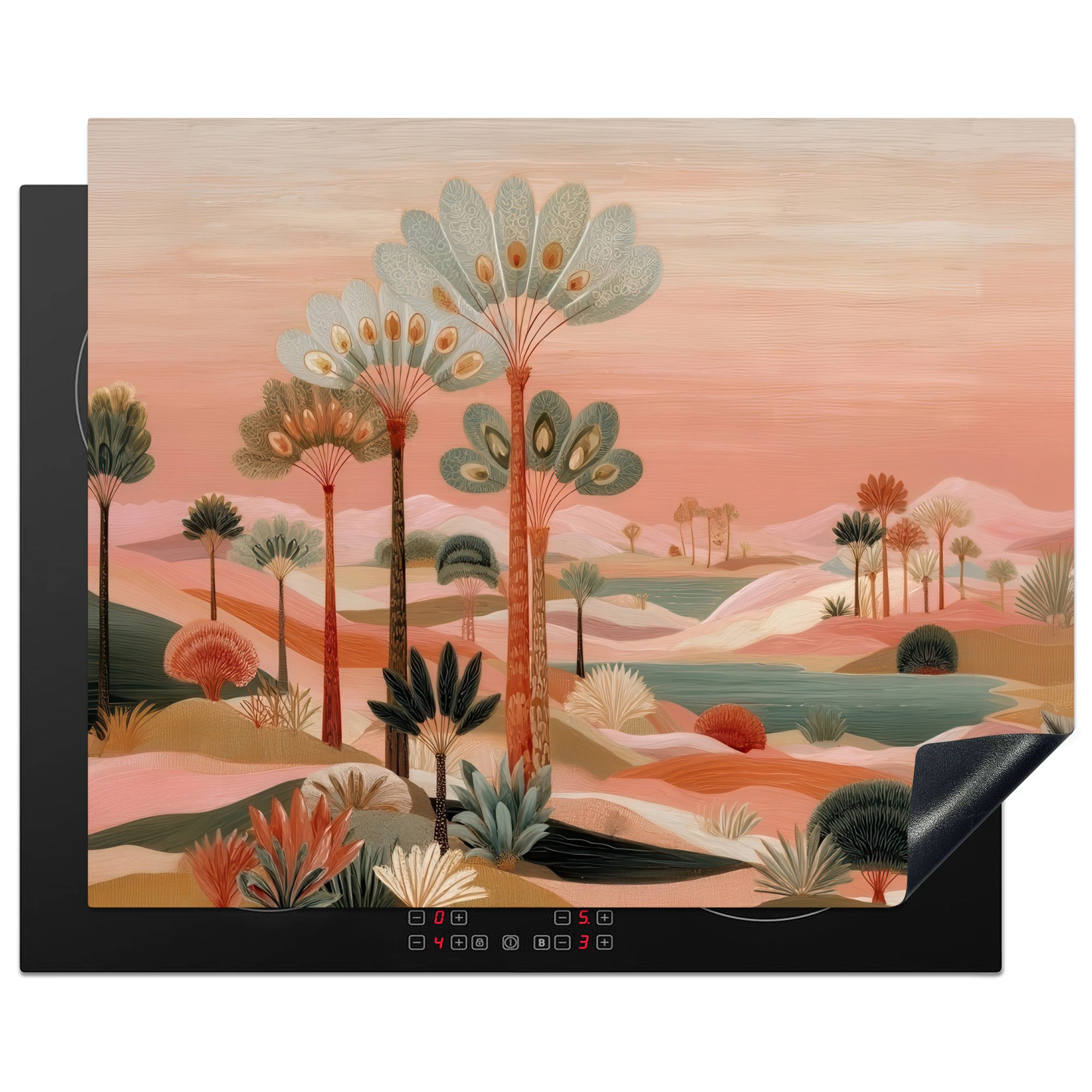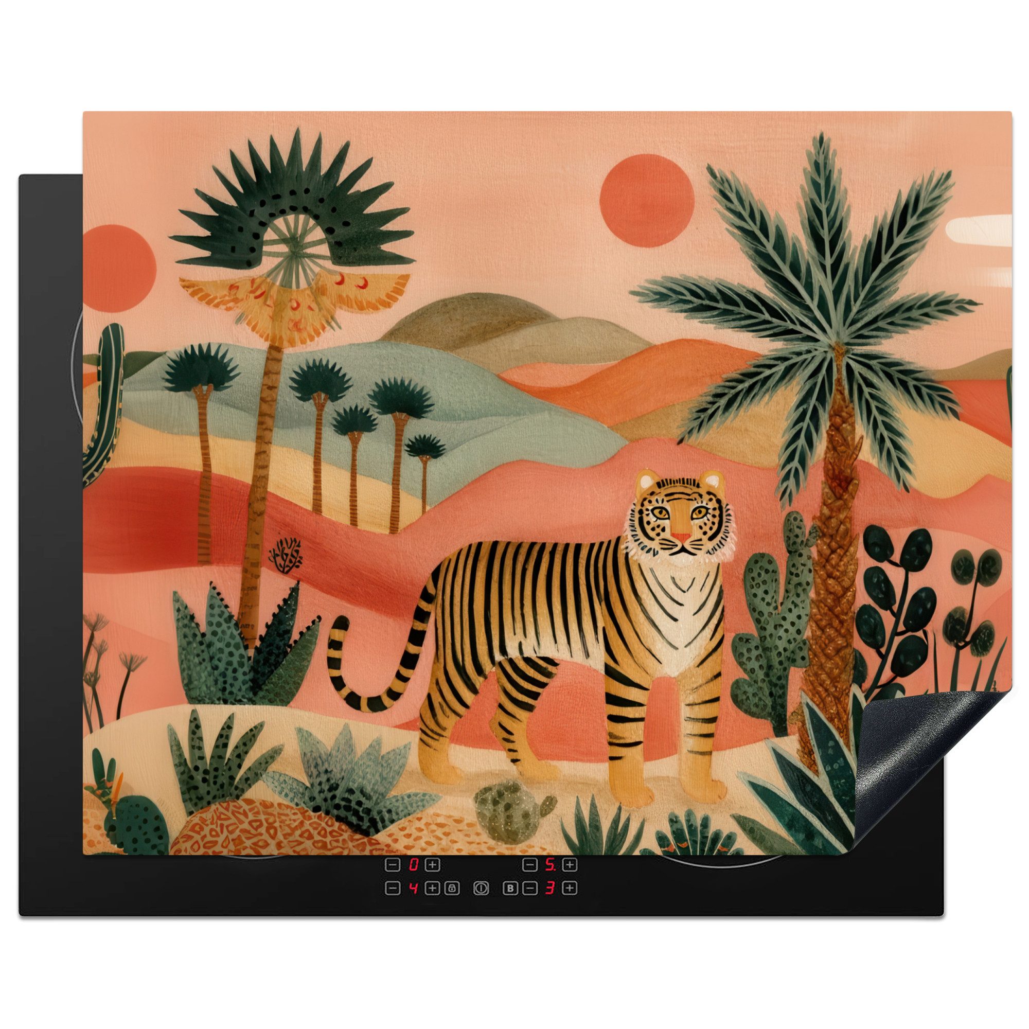 Der stilisierte Tiger steht zwischen Palmen, Kakteen und Sukkulenten, mit Hügeln und einem warmen, orangefarbenen Himmel im Hintergrund.