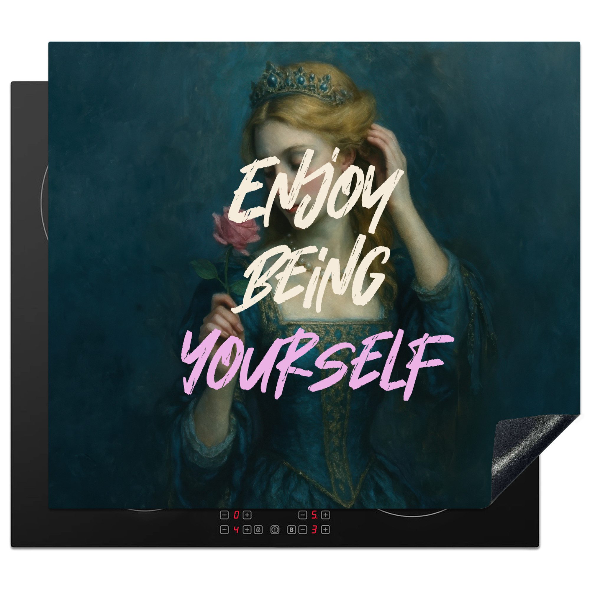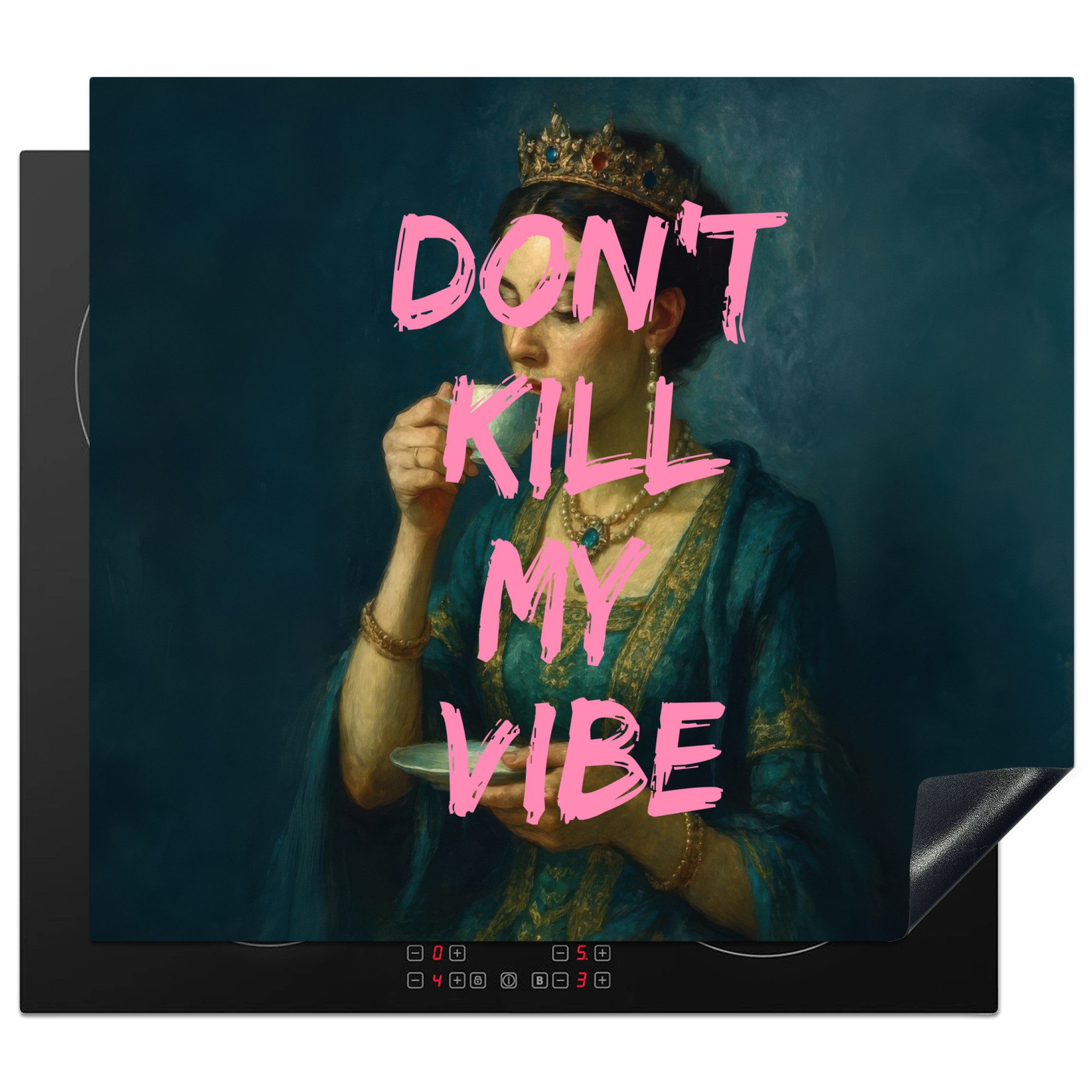 Eine Frau mit Krone trinkt Tee, während über dem Porträt der Text "DON'T KILL MY VIBE" in pinkfarbenen Buchstaben steht.