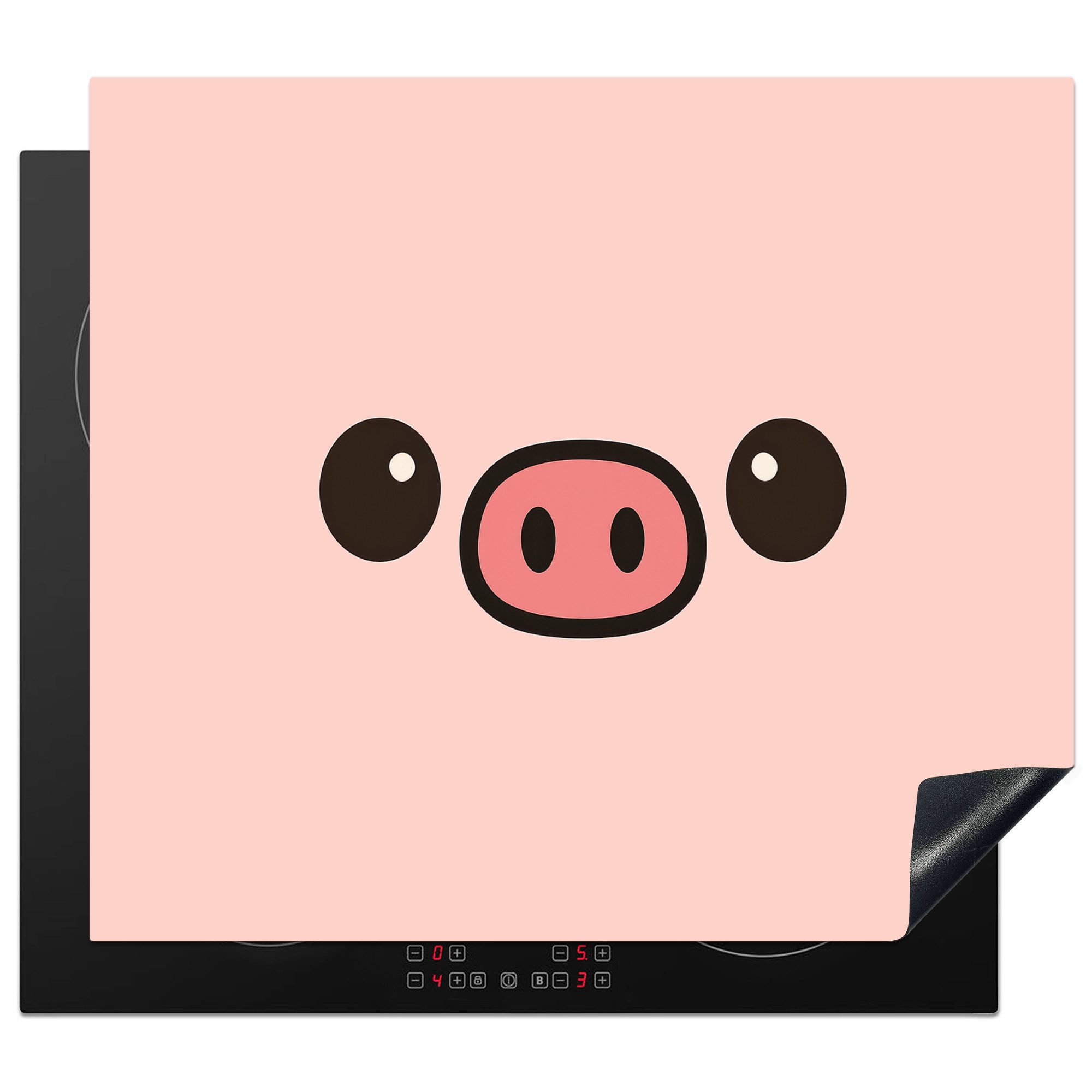 Ein einfaches Schweinegesicht mit großen schwarzen Augen und einer rosafarbenen Schnauze ist auf einem schlichten hellrosa Hintergrund zentriert. Der Stil ist weich und freundlich, mit einer Anspielung auf den Minimalismus.