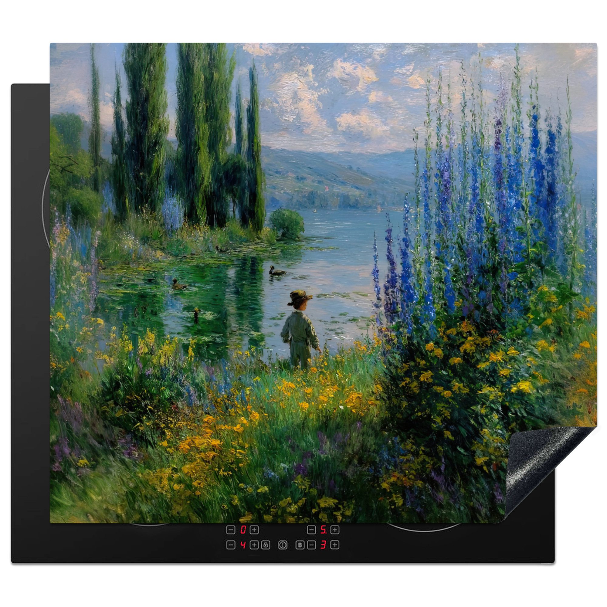 Eine Figur mit Hut steht zwischen hohen Blumen und blickt auf einen ruhigen See mit Bäumen und Bergen im Hintergrund.