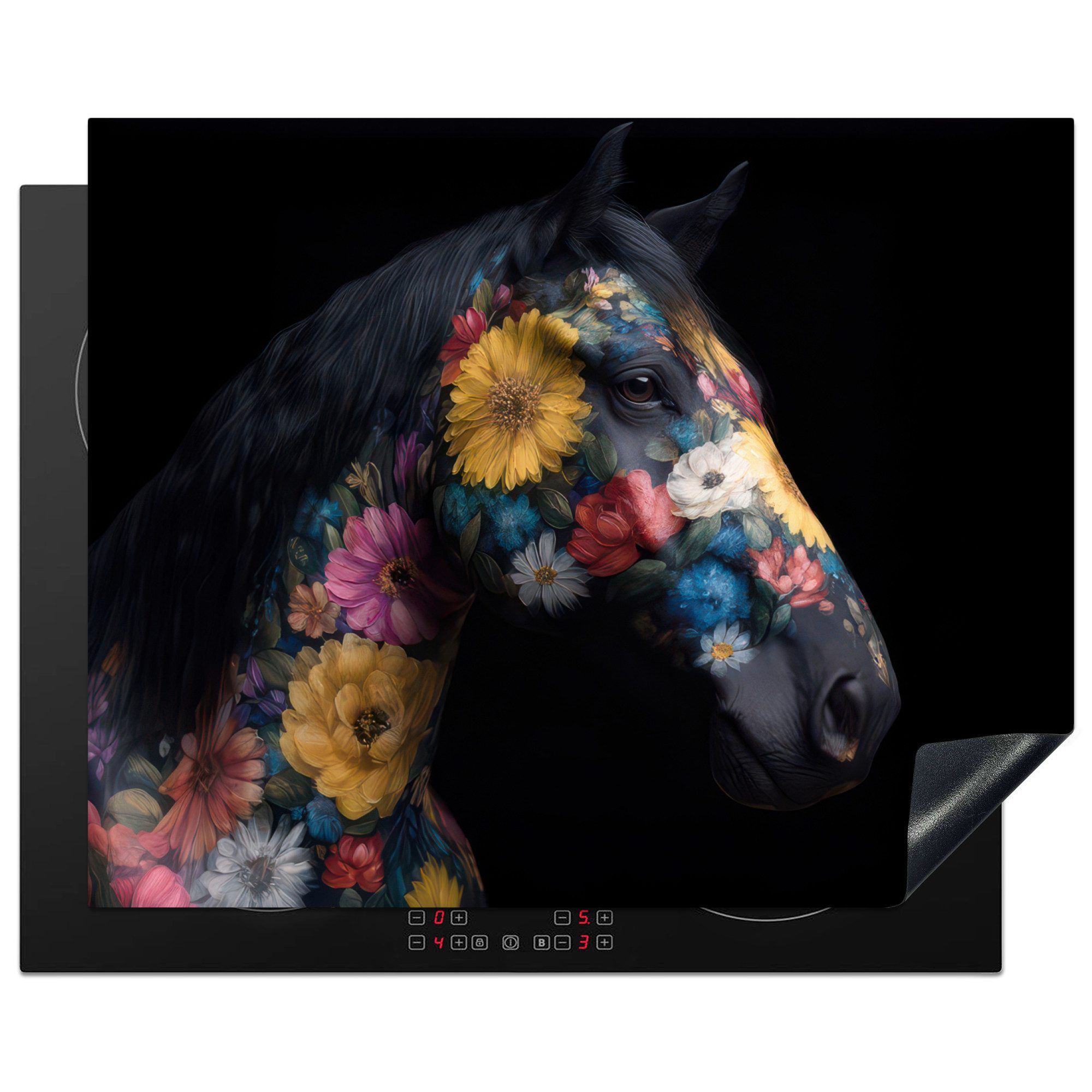 Ein schwarzes Pferd ist mit einem farbenfrohen Blumenmuster bedeckt, darunter Sonnenblumen, Rosen und Gänseblümchen in Gelb, Rot, Weiß und Blau. Details der Mähne und der Hautstruktur bleiben unter der Blumendekoration sichtbar. Der schwarze Hintergrund verstärkt den Kontrast und die Magie des Bildes.