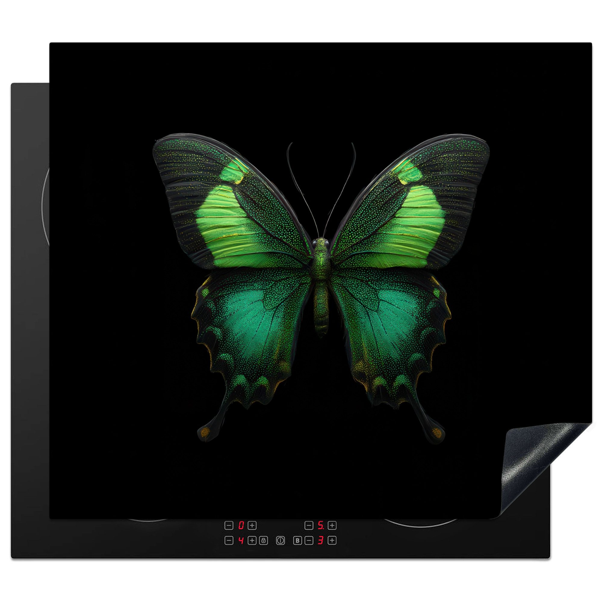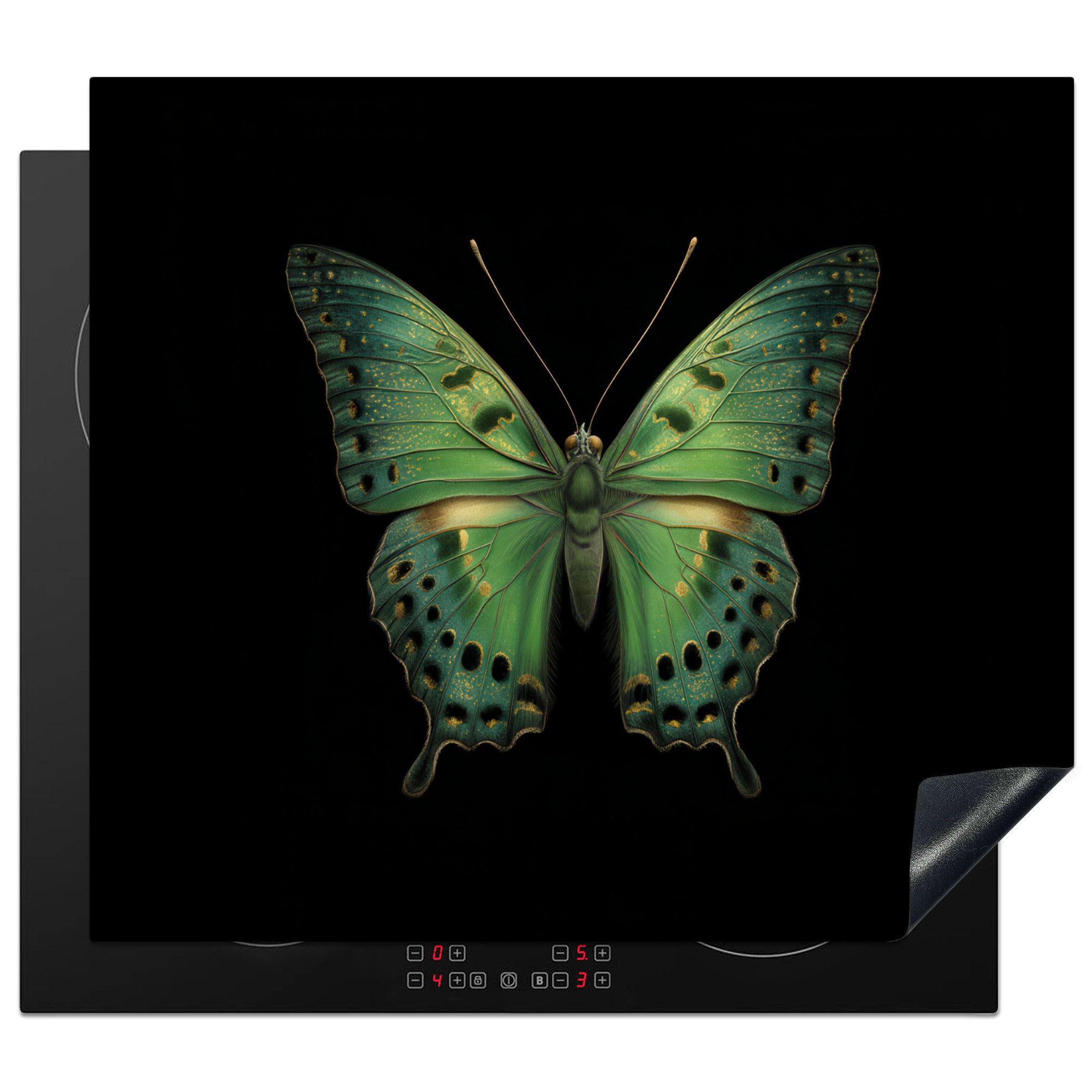 Ein auffälliger Schmetterling mit glänzenden Flügeln in smaragd- und lindgrünen Farbtönen. Die unteren Flügel haben eine gewellte, fast schwanzartige Spitze. Feine gelbe Sprenkel verstärken den schillernden Effekt auf dem dunklen Hintergrund.