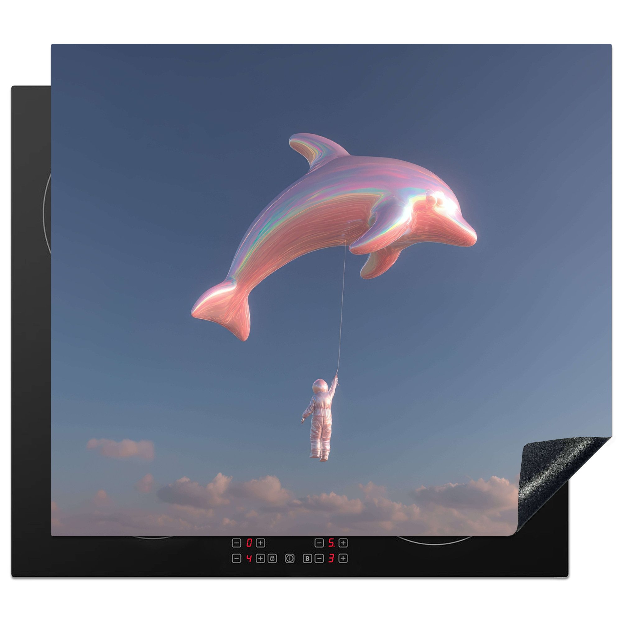 Ein kleiner Astronaut schwebt hoch am Himmel, gehalten von einem glänzenden, rosafarbenen Delphinballon. Der Ballon reflektiert Pastellfarben und schwebt über einem Meer von Wolken unter einem klaren blauen Himmel.
