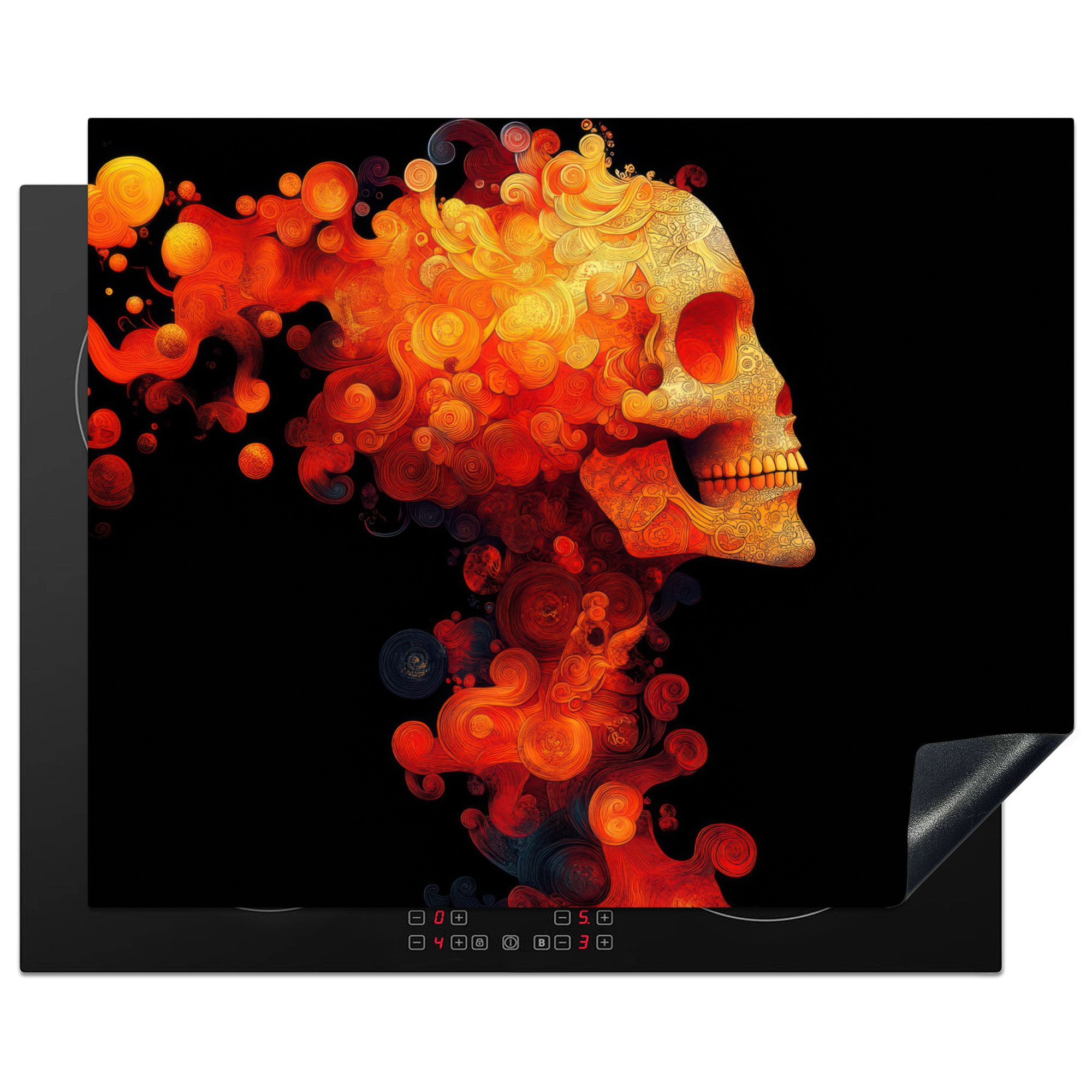 Schädel in Seitenansicht, bestehend aus feurigen orangefarbenen und roten Spiralen. Die Formen erinnern an aufsteigende Flammen.