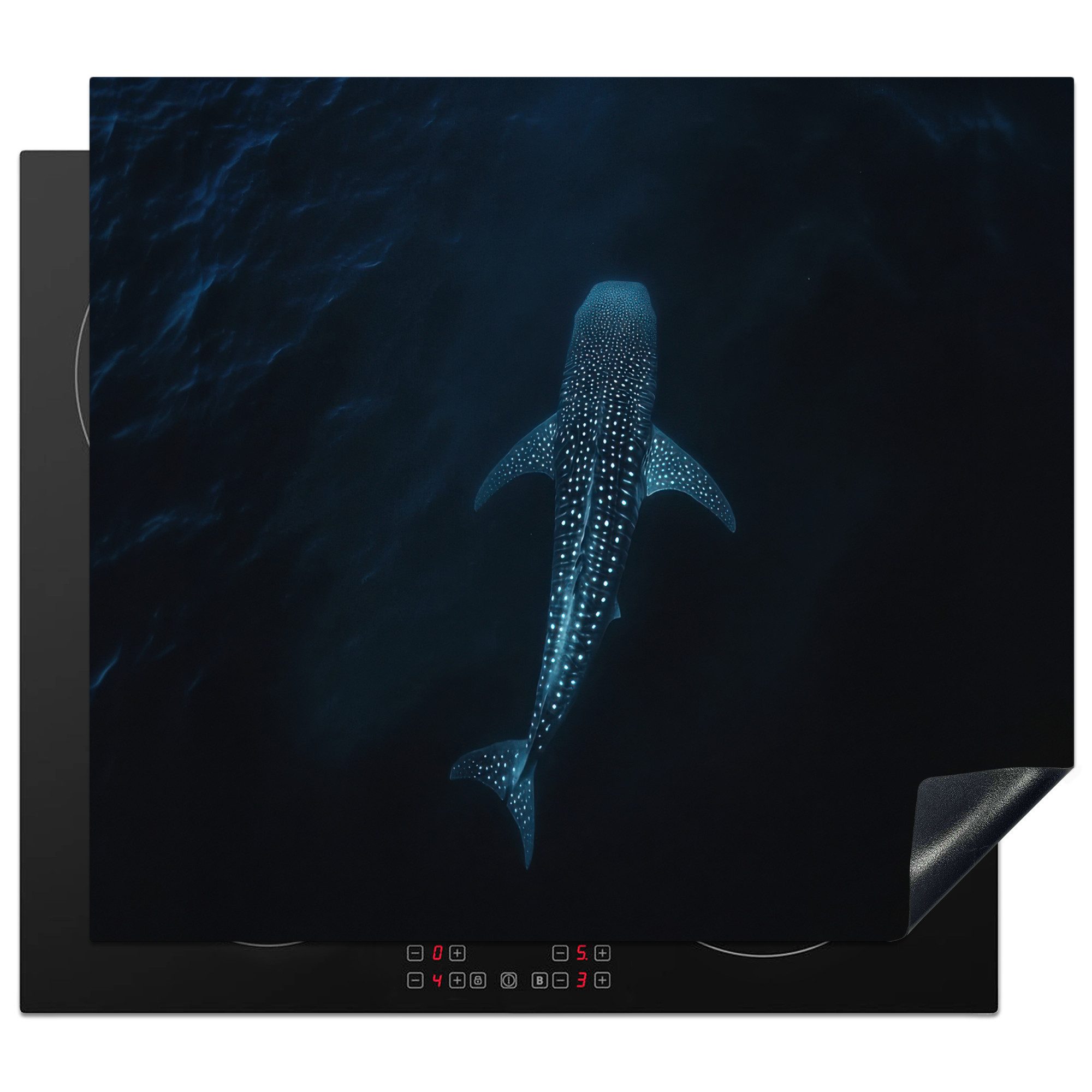 Ein Walhai schwimmt langsam durch dunkelblaues Meerwasser, beleuchtet von einem schwachen Licht von oben. Die weißen Flecken auf seiner Haut kontrastieren mit dem dunklen Wasser.