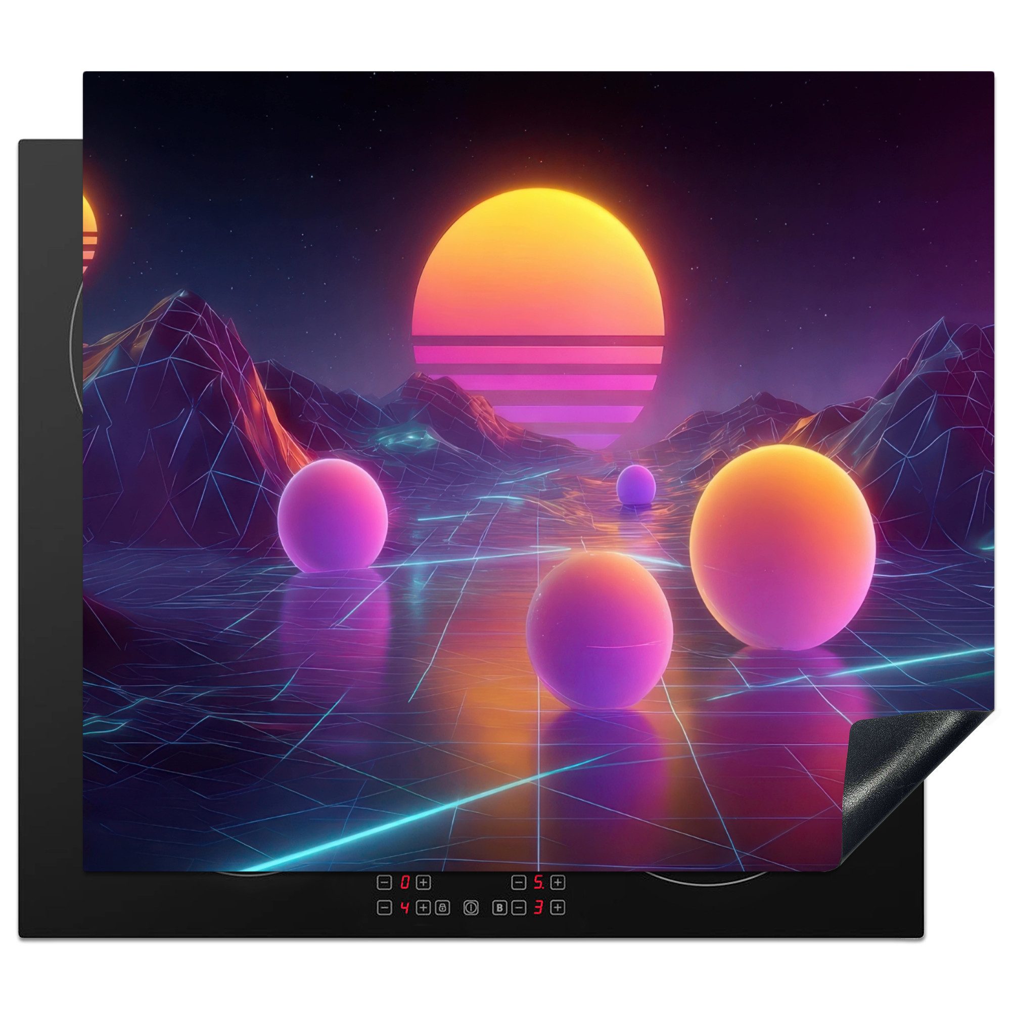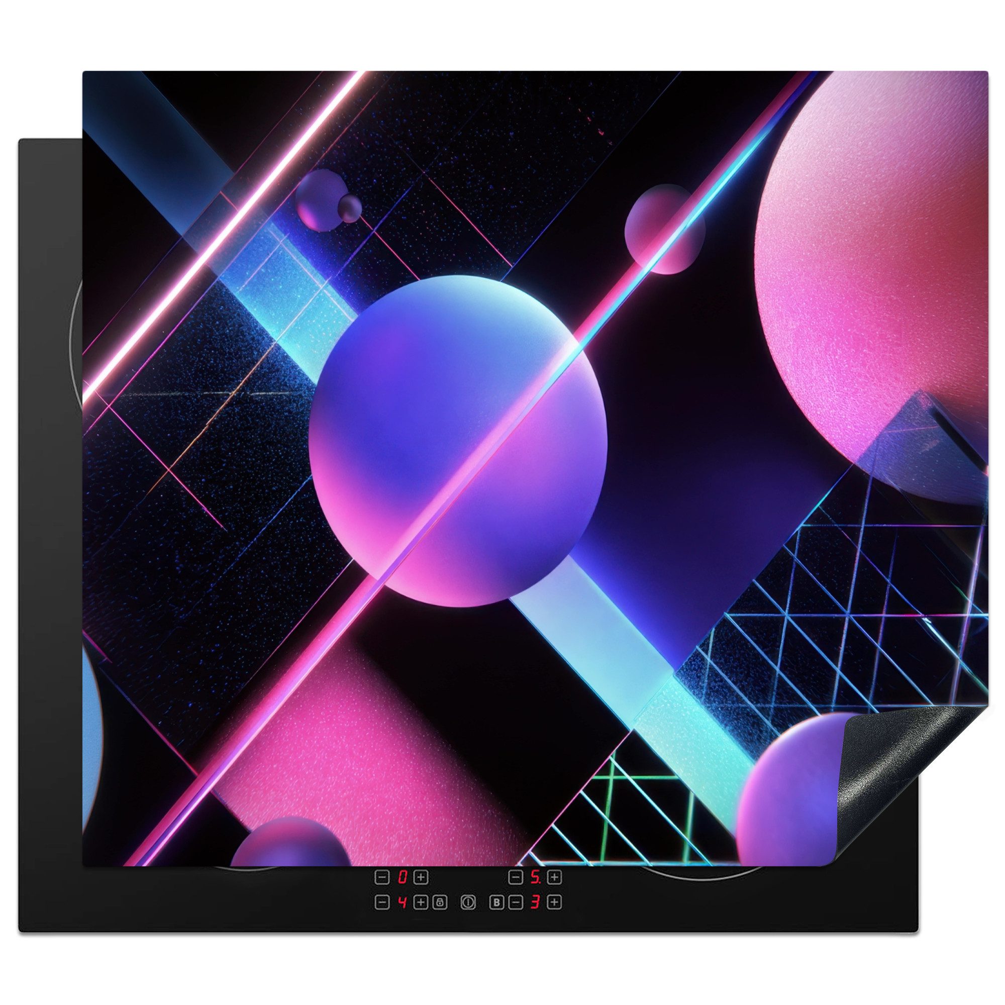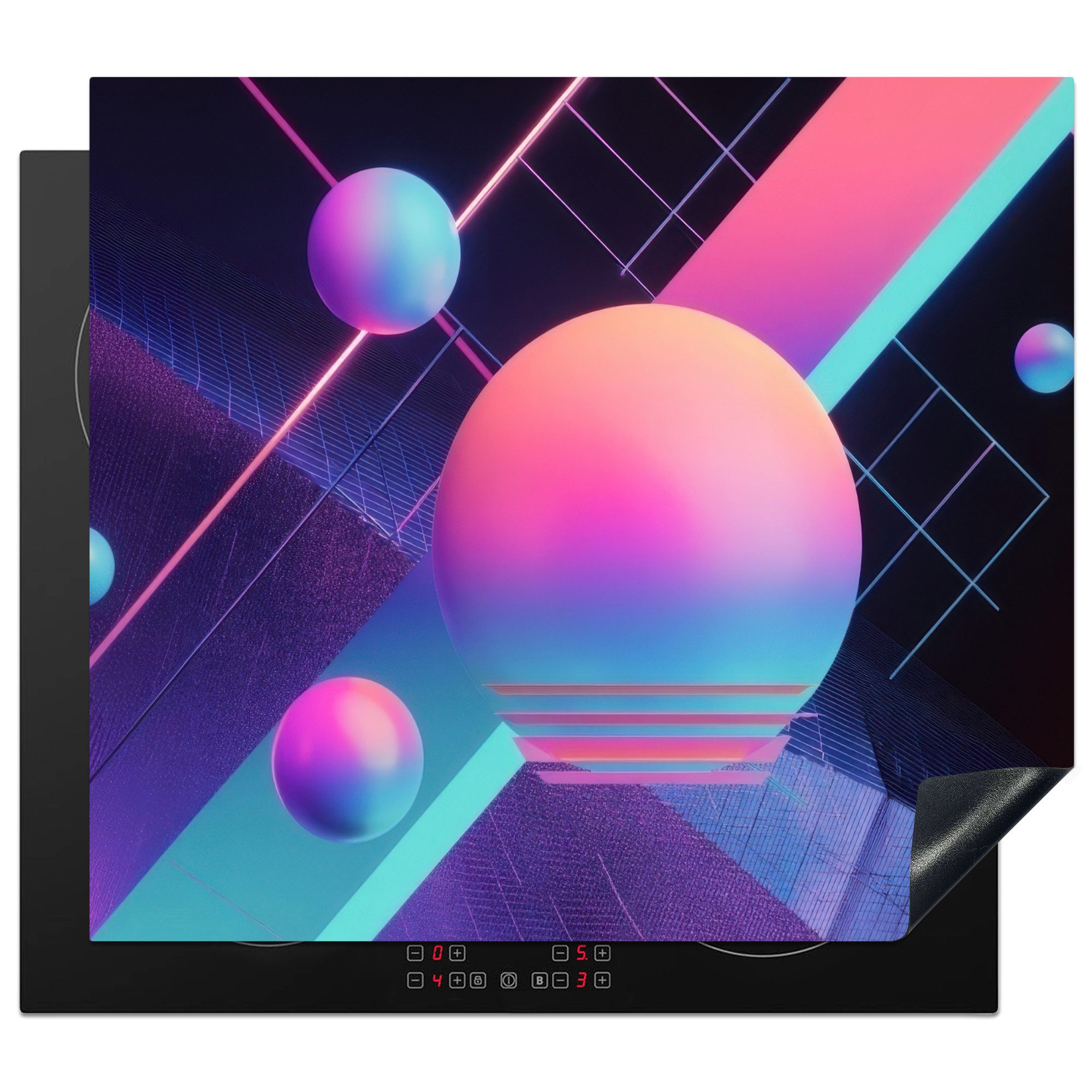 Eine zentrale, bunte Kugel schwebt zwischen kleineren Kugeln und diagonalen Flächen. Die leuchtenden rosa, blauen und violetten Farbtöne schaffen eine dynamische, futuristische Atmosphäre.