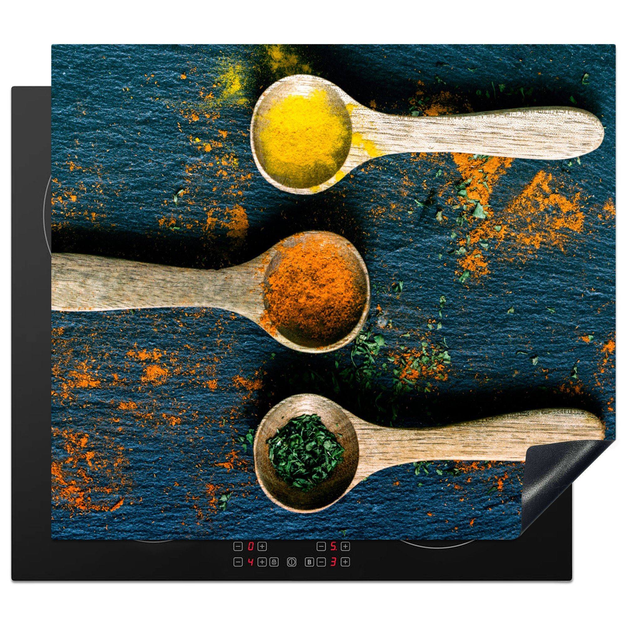 Ein Display mit Kräutern in drei verschiedenen Farben, die auf Holzlöffeln auf blauem Hintergrund liegen.Farbe | Blau - Löffel |