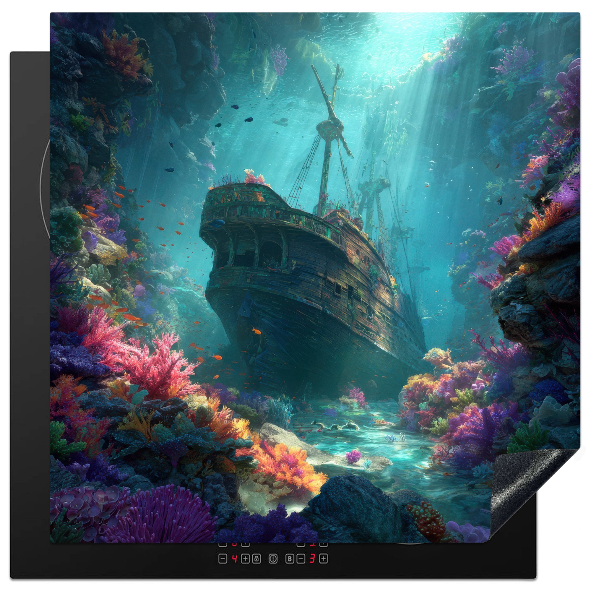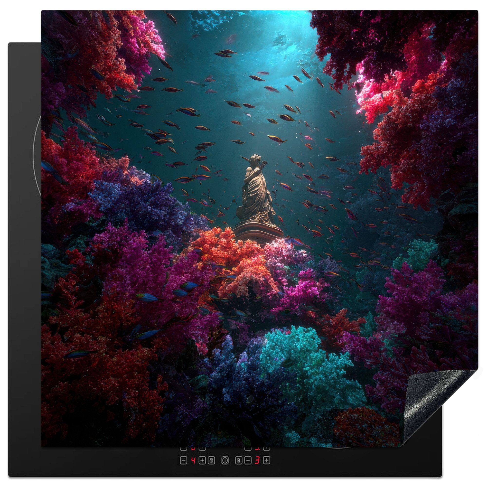 Eine Statue steht auf dem Meeresgrund, umgeben von einer Hecke aus bunten Korallen und einem Fischschwarm, der an ihr vorbeischwimmt.