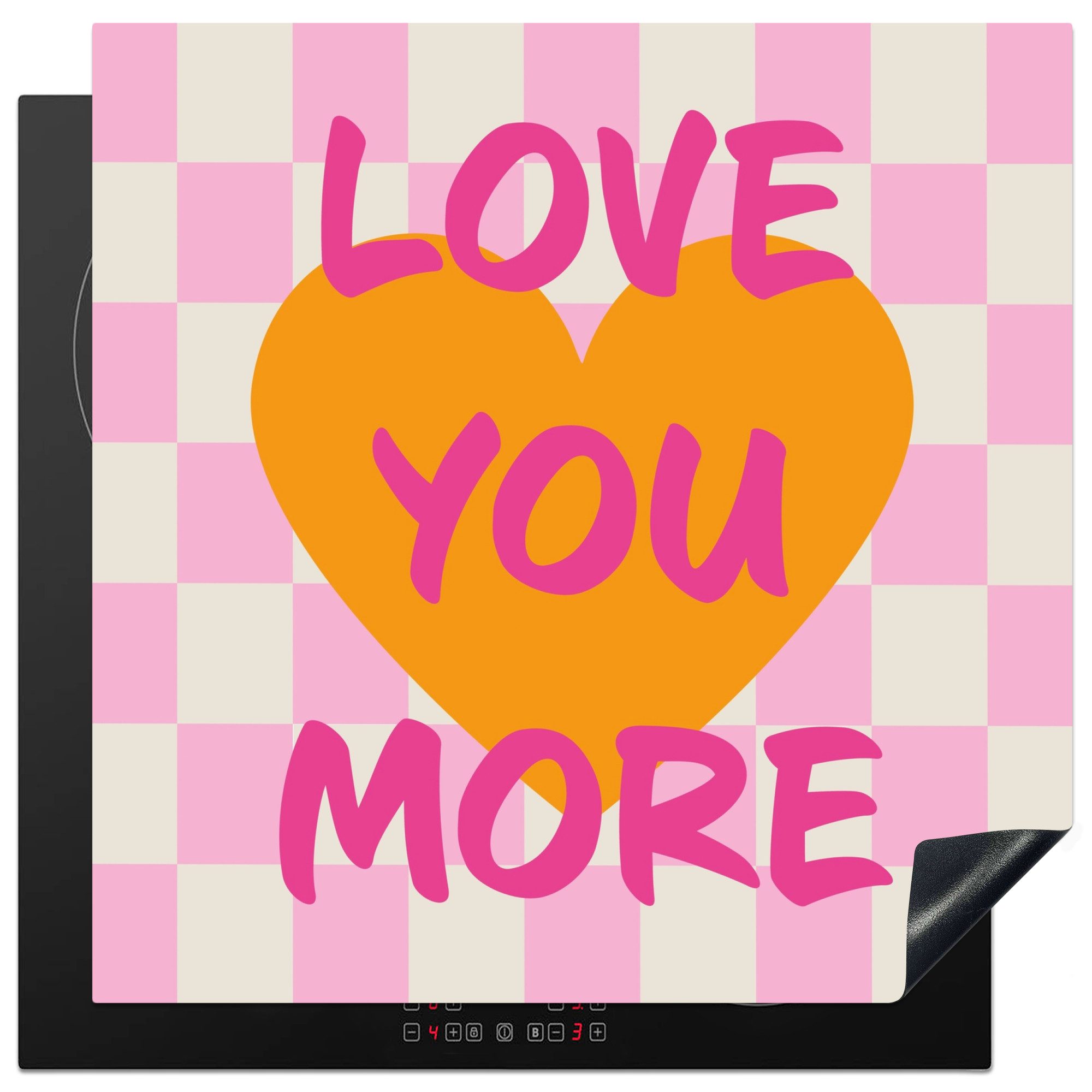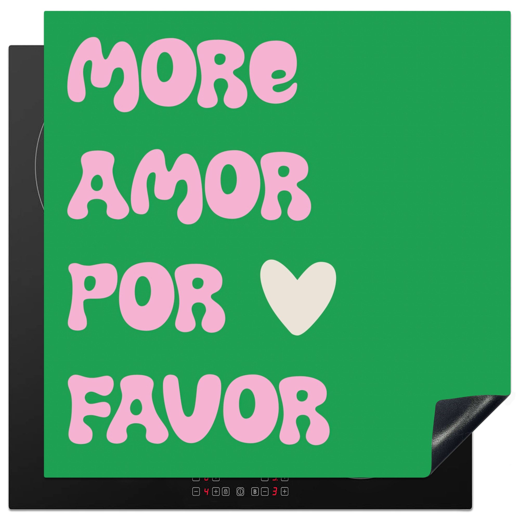 Der Text "MORE AMOR POR FAVOR" in zartrosa Buchstaben mit einer verspielten Retro-Schriftart auf grünem Hintergrund. Ein schlichtes weißes Herz unterstreicht die liebevolle Botschaft, während die kontrastierenden Farben für einen frischen und lebendigen Look sorgen.Farbe | Text - Grün - Rosa |
