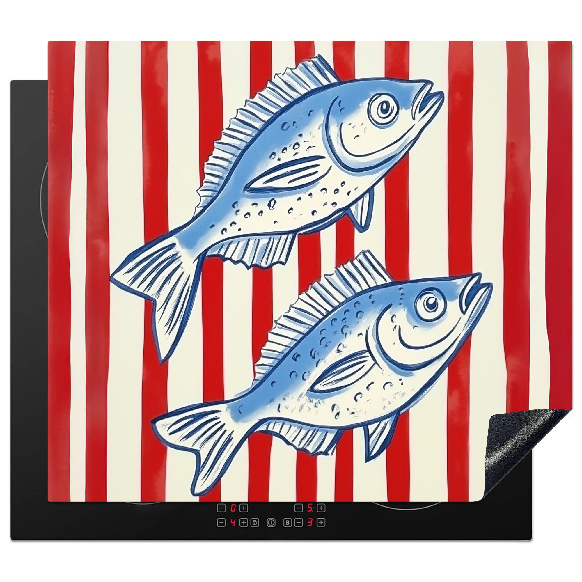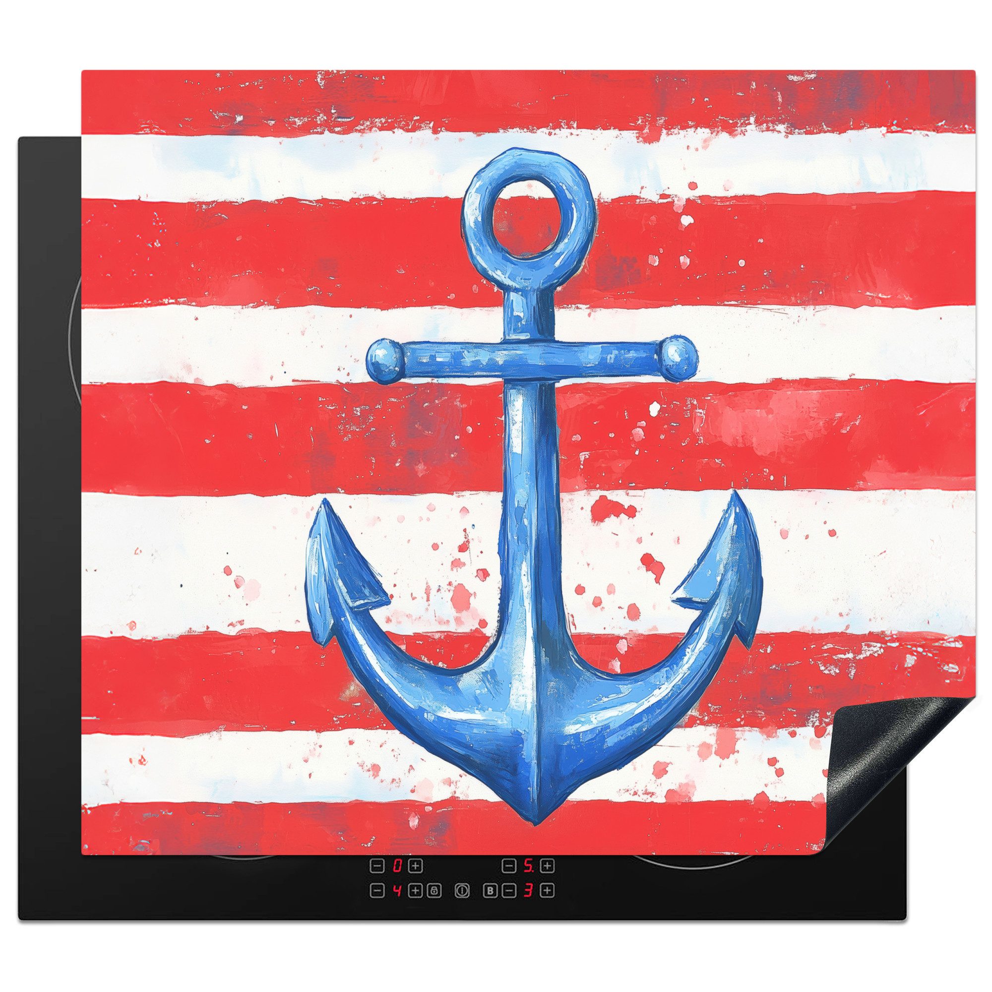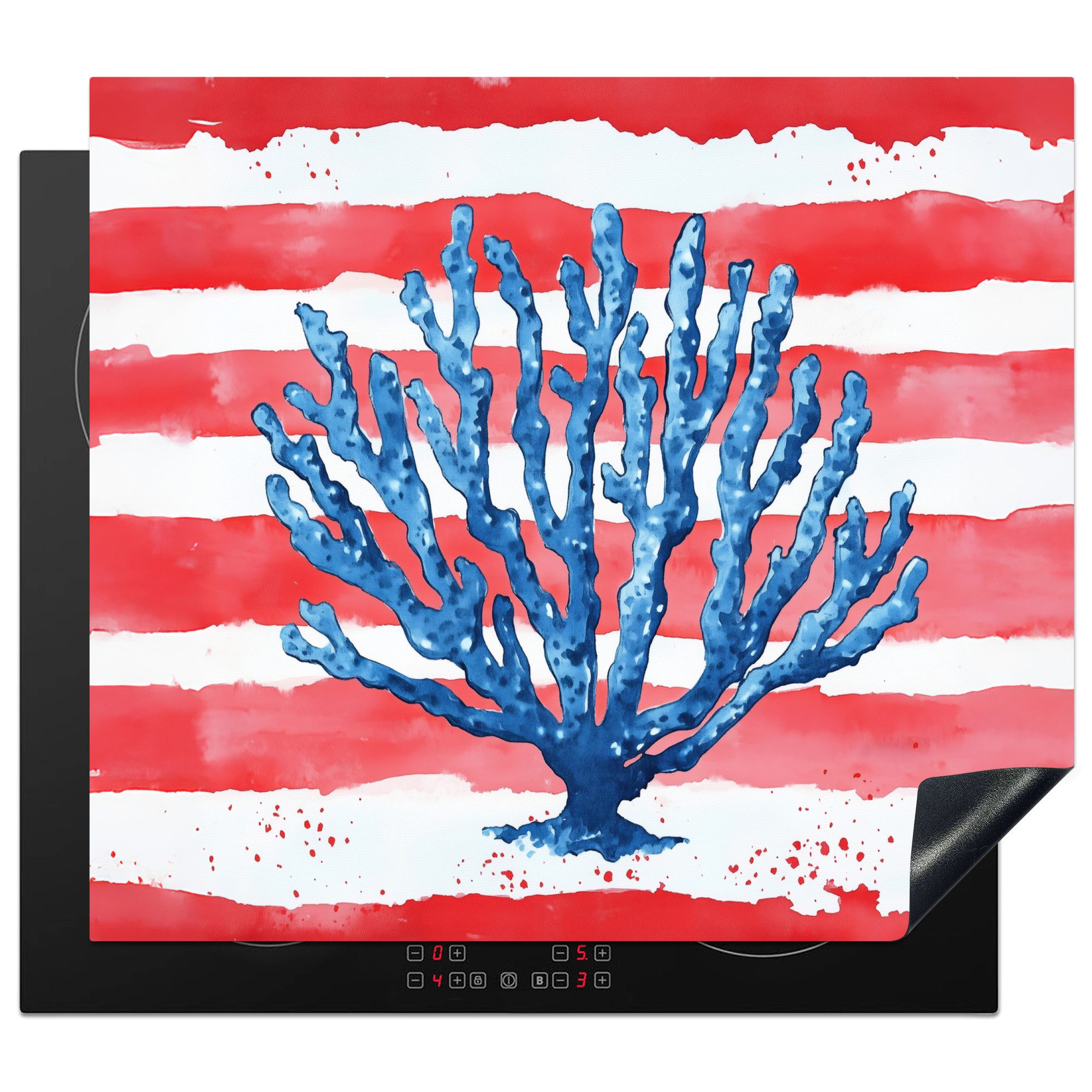 Stilisierte blaue Korallenform auf einem Hintergrund aus roten und weißen Querstreifen mit Farbtextur.