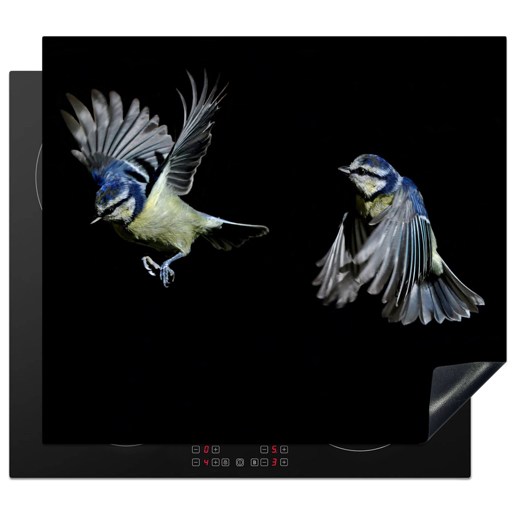 Porträt von zwei Vögeln auf schwarzem Hintergrund. Die Vögel haben blaue und gelbe Federn.Farbe | разноцветный |