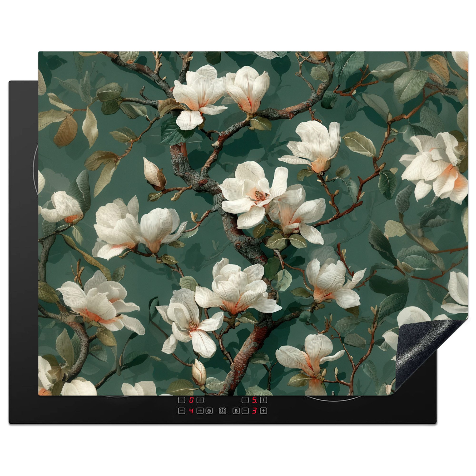 Ein Muster aus blühenden Magnolien vor einem dunkelgrünen Hintergrund. Die Kombination aus Blumen und Zweigen schafft ein klassisches und anspruchsvolles Bild.