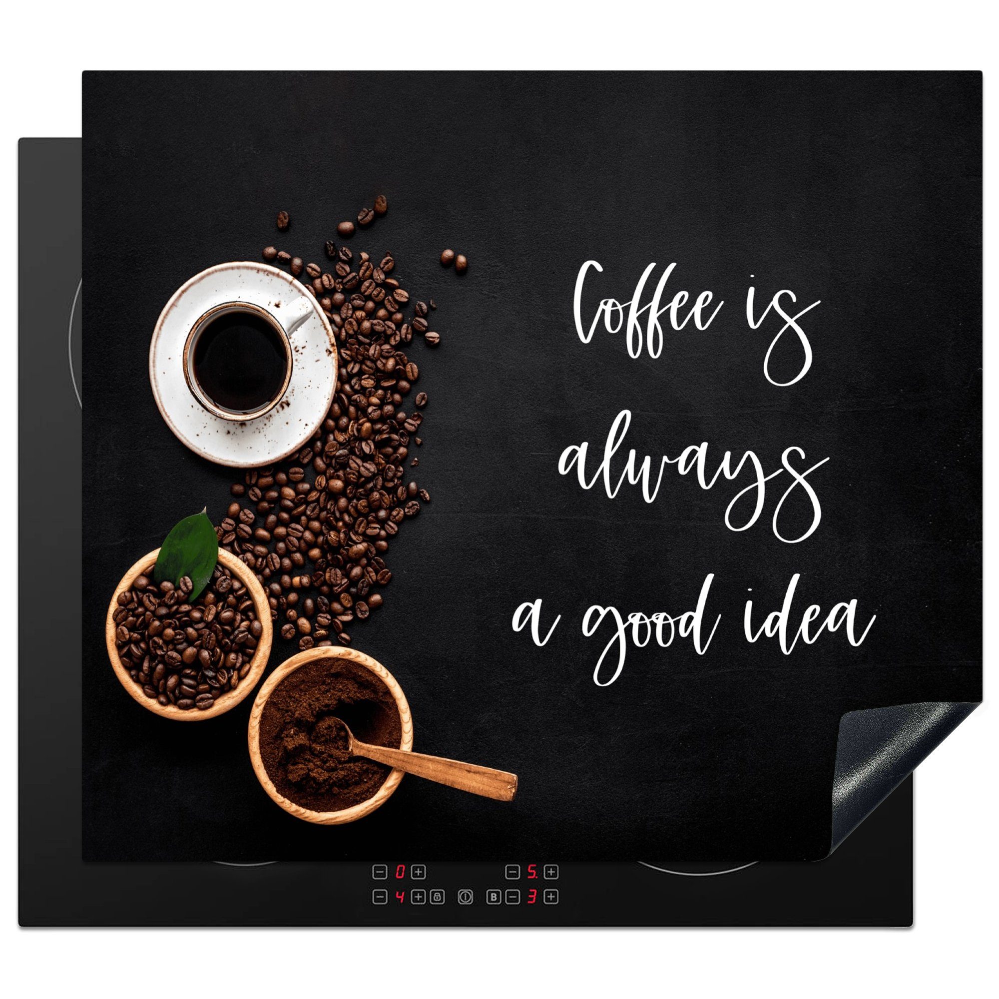 Das Zitat: "Kaffee ist immer eine gute Idee" steht auf einem dunklen Hintergrund mit verschiedenen Kaffeeprodukten.Farbe | разноцветный |