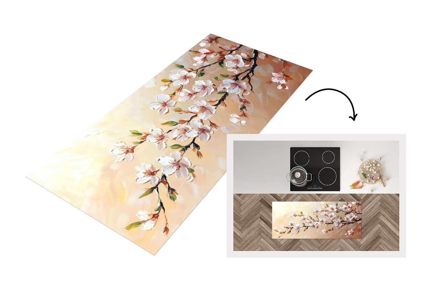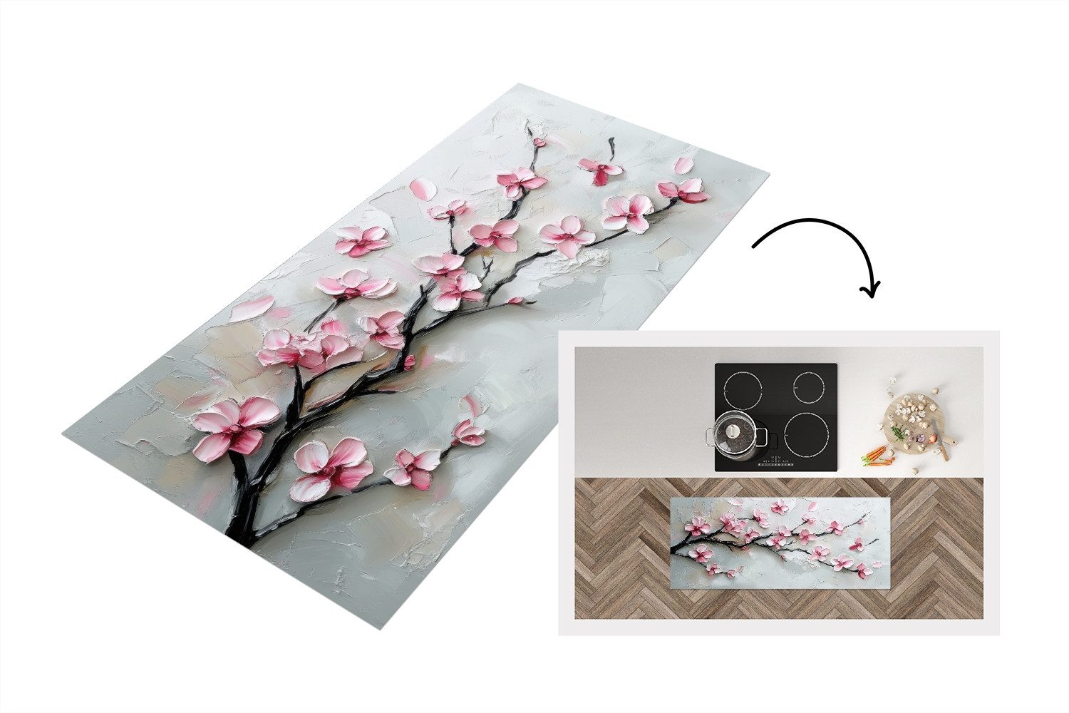Ein Zweig mit rosa Blüten, gemalt mit einer dicken Farbtextur. Der helle Hintergrund hebt die Blumen hervor und verleiht ihnen eine künstlerische Wirkung.
