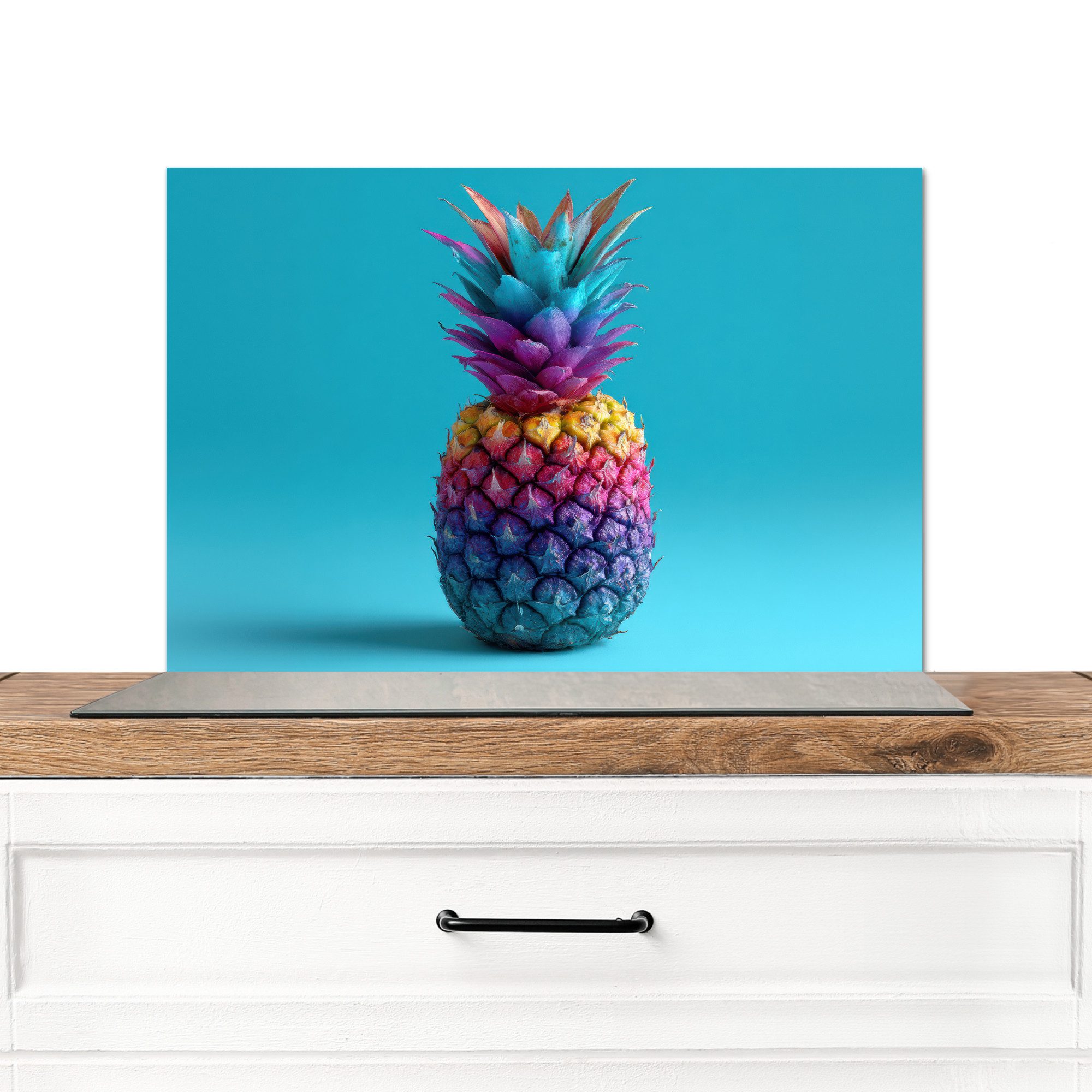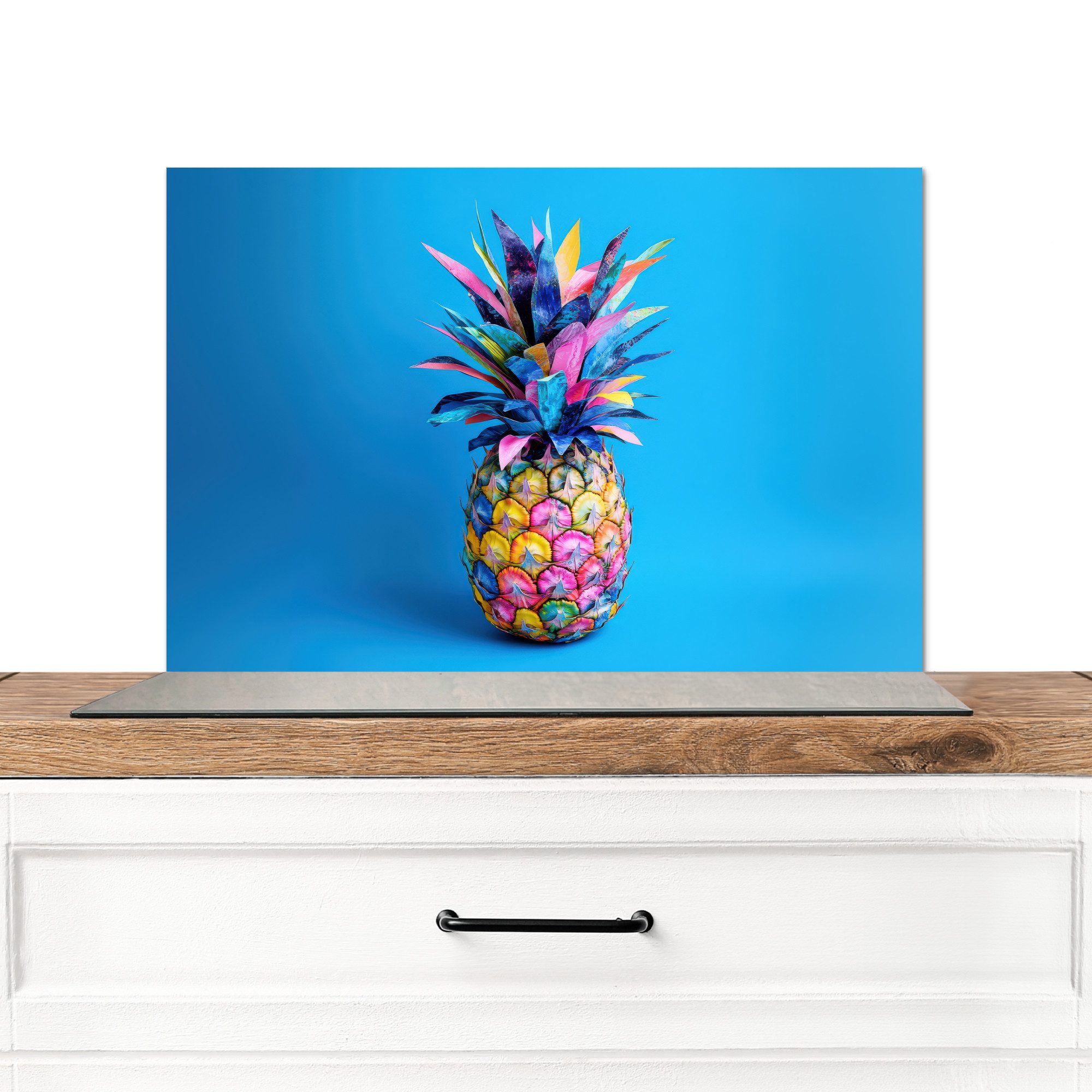Diese überschwängliche Ananas ist das ultimative Symbol für tropische Energie und kreative Freiheit. In leuchtenden Pink-, Blau-, Gelb- und Violetttönen gefärbt, mit einer Blätterkrone, die an eine Explosion von Papierkunst erinnert, strahlt dieses Kunstwerk pure Freude aus. Der leuchtend blaue Hintergrund verstärkt den spielerischen Kontrast und lässt die Ananas auf dem Bild fast tanzen.