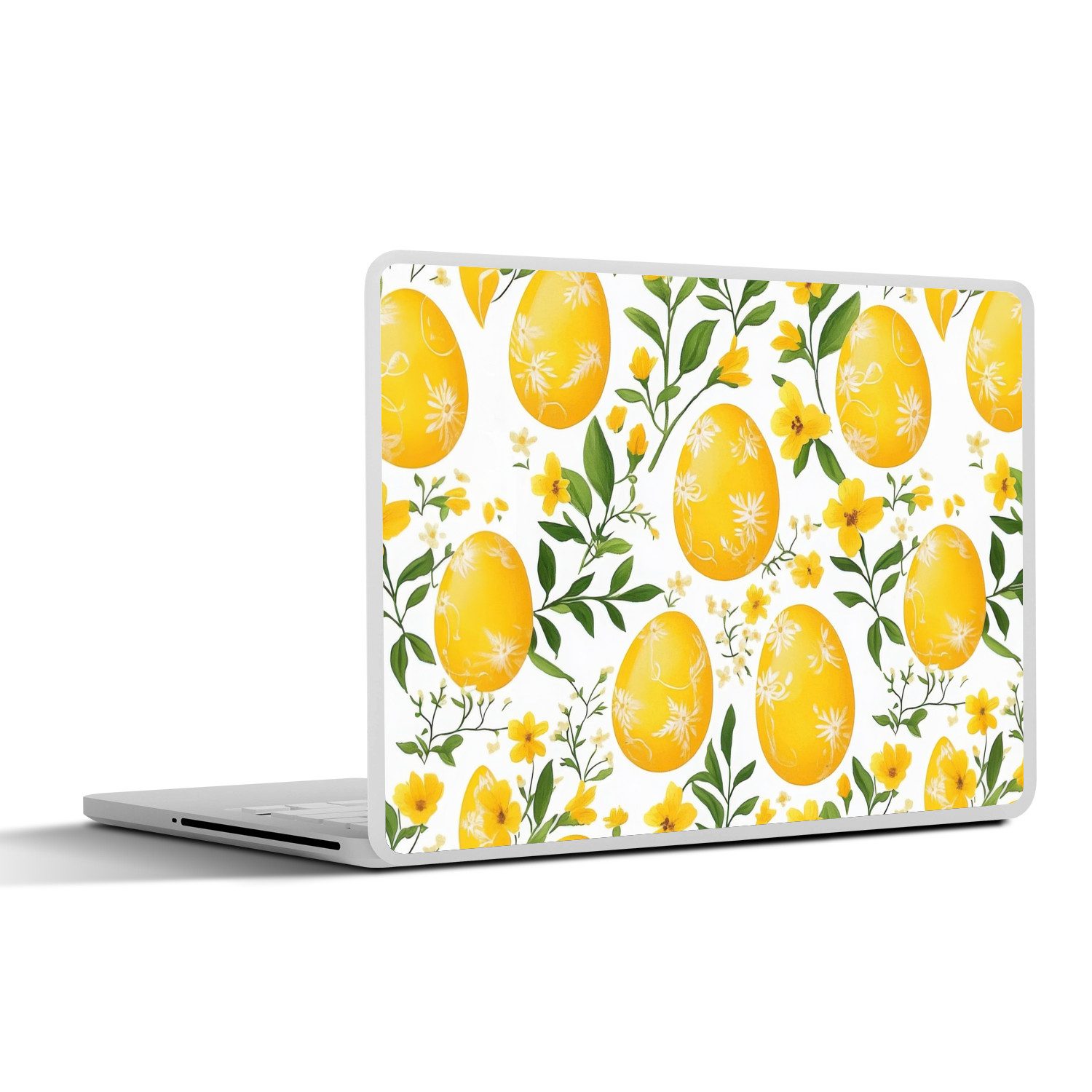 Ein fröhliches Muster mit sonnengelben Ostereiern, die mit weißen Blumenmustern verziert sind. Zwischen den Eiern wachsen grüne Blätter und kleine gelbe Blüten, die eine lebendige und frühlingshafte Atmosphäre schaffen.