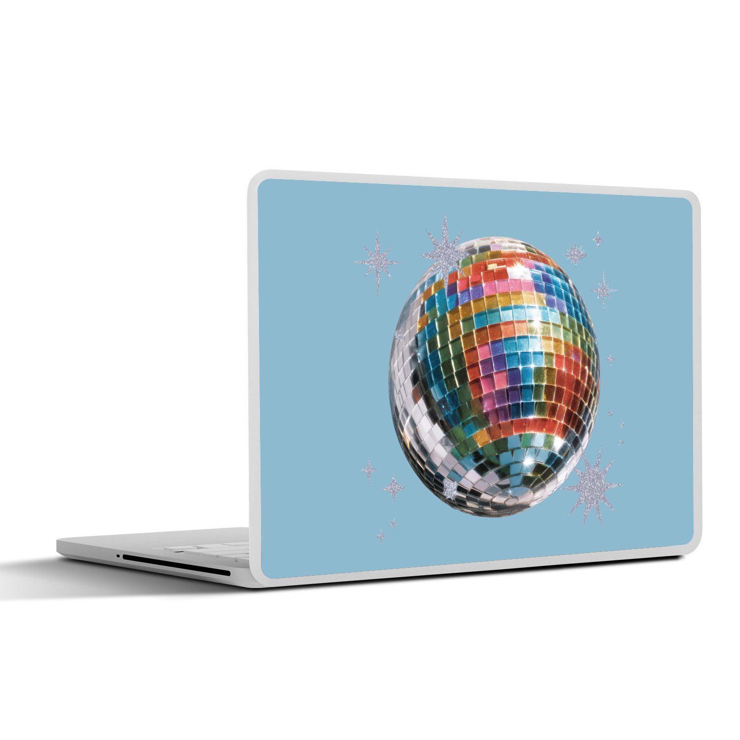 Eine glänzende Discokugel mit farbigen Spiegelkacheln schwebt vor einem gleichmäßigen blauen Hintergrund, umgeben von glitzernden Sternen.