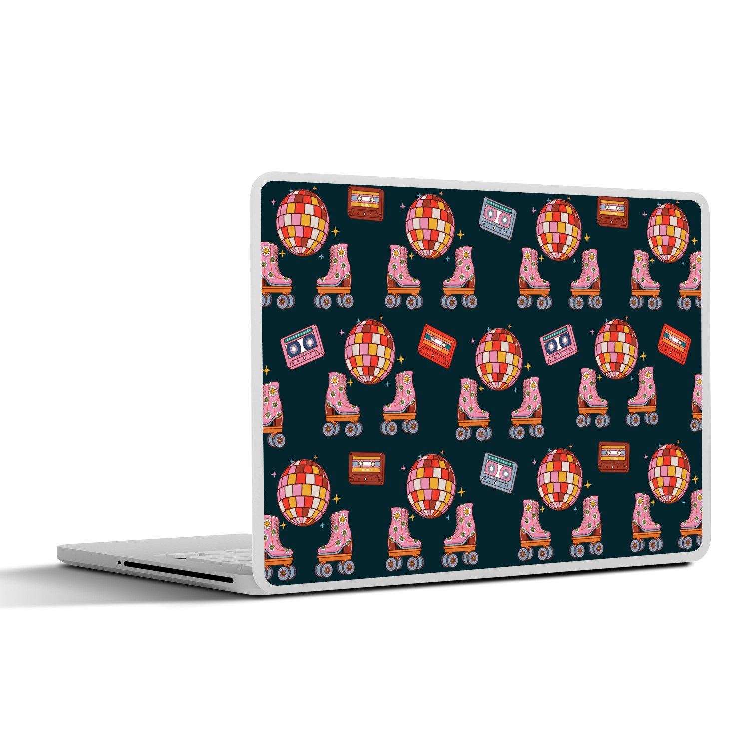 Ein verspieltes Muster mit rosa Rollschuhen, die mit Blumen, bunten Discokugeln und Kassetten auf einem dunklen Hintergrund verziert sind. Helle Sternenakzente sorgen für einen festlichen, nostalgischen Look, der an eine Disco-Nacht der 1970er Jahre erinnert.