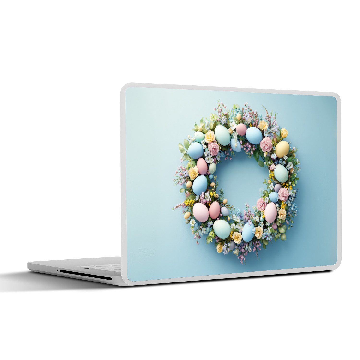 Ein wunderschöner Kranz aus pastellfarbenen Ostereiern, Blumen und grünen Blättern vor einem hellblauen Hintergrund. Die zarten Farben und floralen Details verströmen eine frische Frühlingsstimmung.