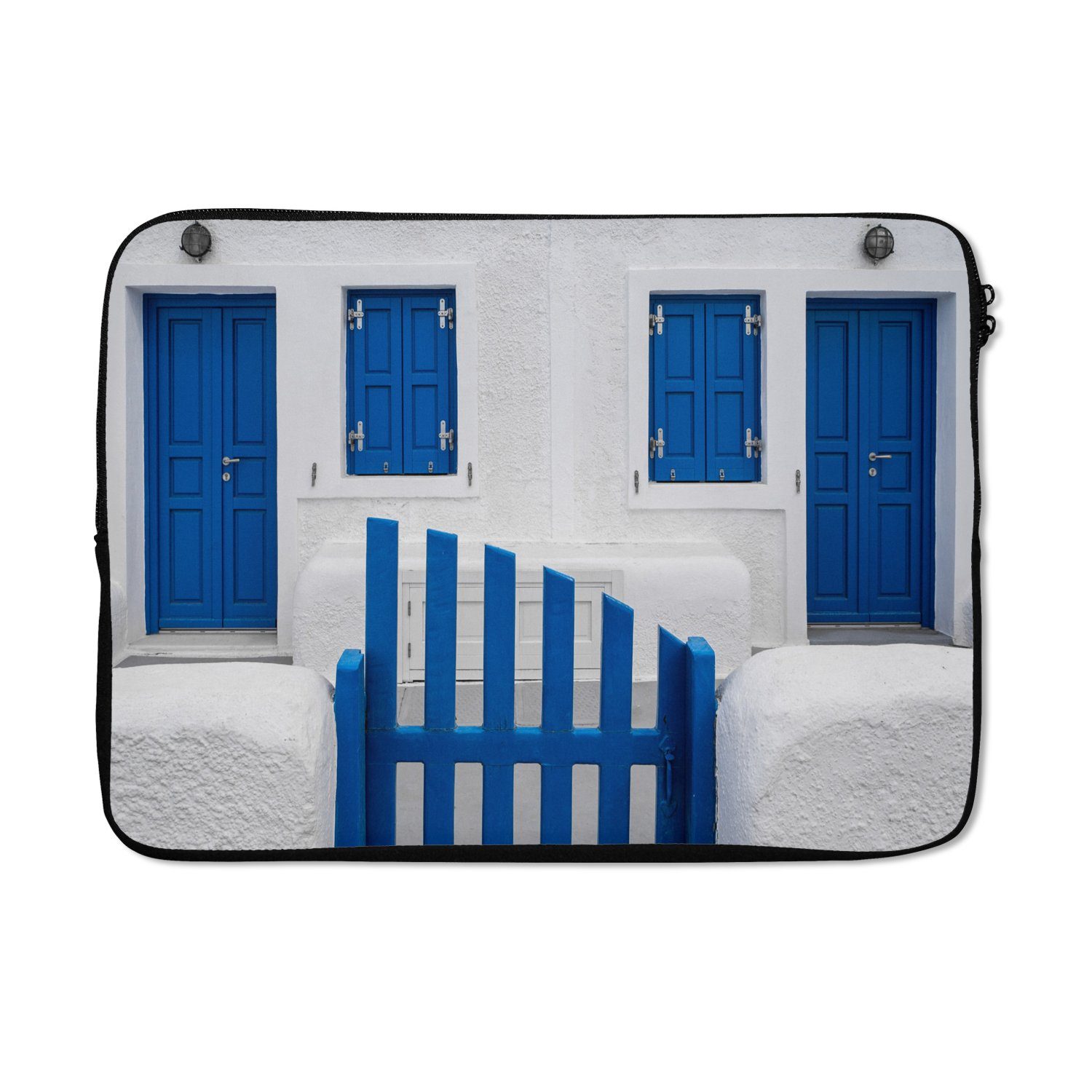 Ein griechisches Haus mit blauen Fenstern und Türen und weißen Wänden.Kompatible Geräte | Apple, HP, Dell, Lenovo, Microsoft |