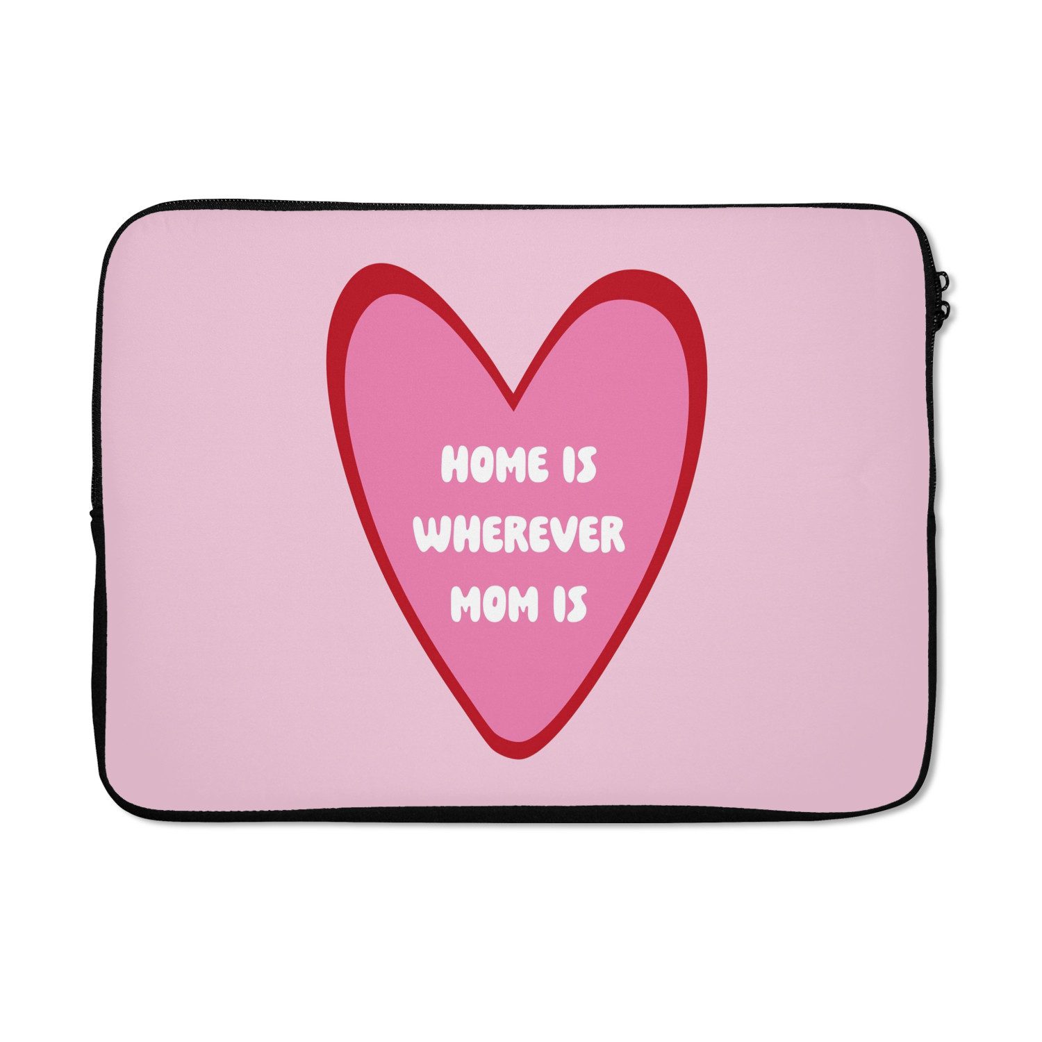 Ein rosa Hintergrund mit einem großen rosa Herz mit rotem Umriss. Innen steht in weißen Buchstaben der Text "Home is wherever mom is", der Wärme und Verbundenheit ausstrahlt.