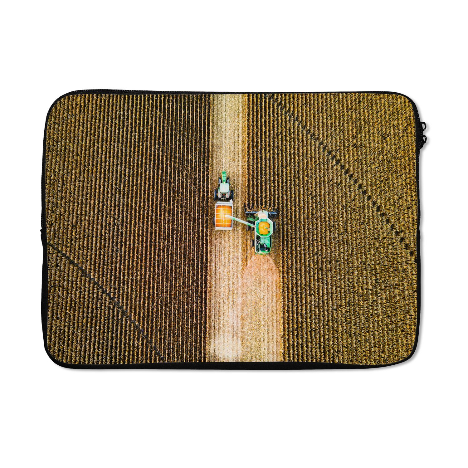 Sind Sie immer noch auf der Suche nach einer Möglichkeit, Ihren Laptop zu schützen? Dann ist dies das perfekte Produkt für Sie! Eine Laptoptasche mit einem Bild von einem Traktor und einem Mähdrescher, das Bild ist von oben aufgenommen.
