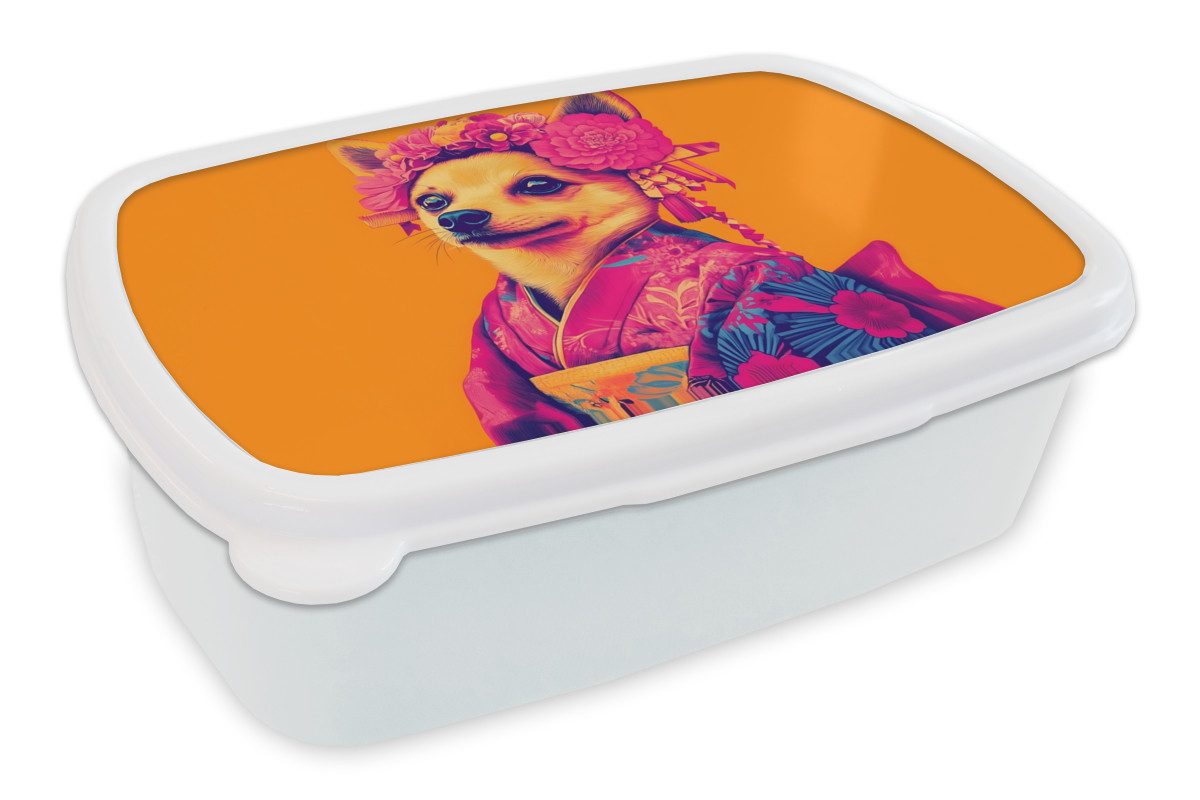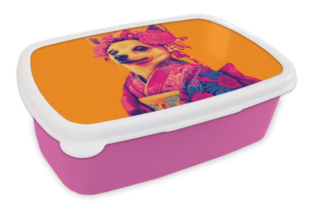 Ein Chihuahua in einem rosa, blumengemusterten Kimono mit einer Blumenkrone auf dem Kopf. Der Hintergrund ist leuchtend orange und unterstreicht das farbenfrohe Tier und sein traditionelles japanisches Outfit.
