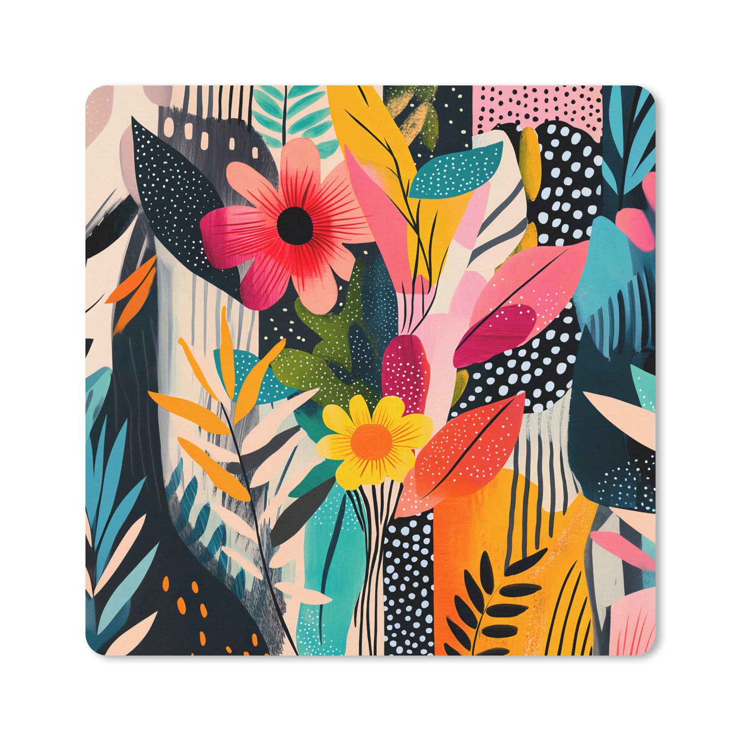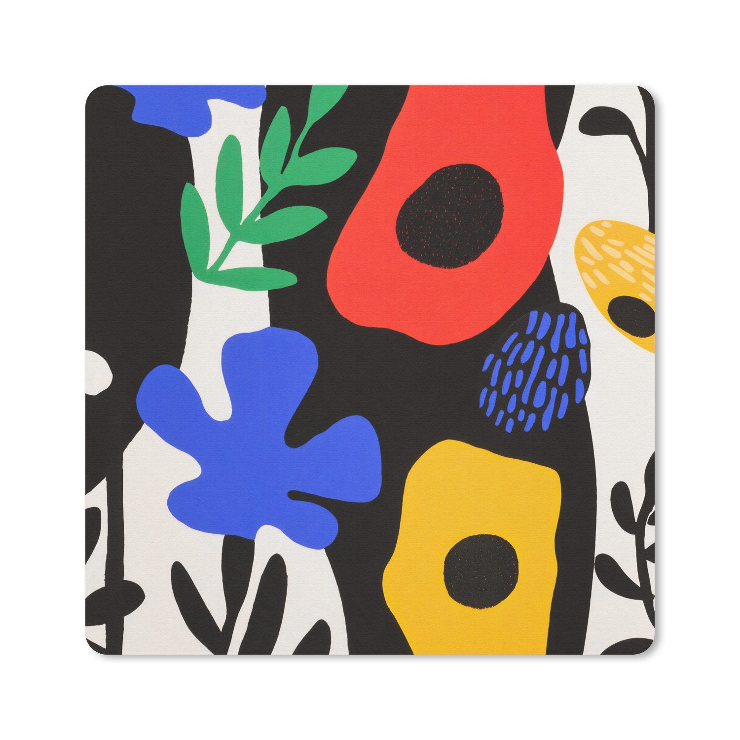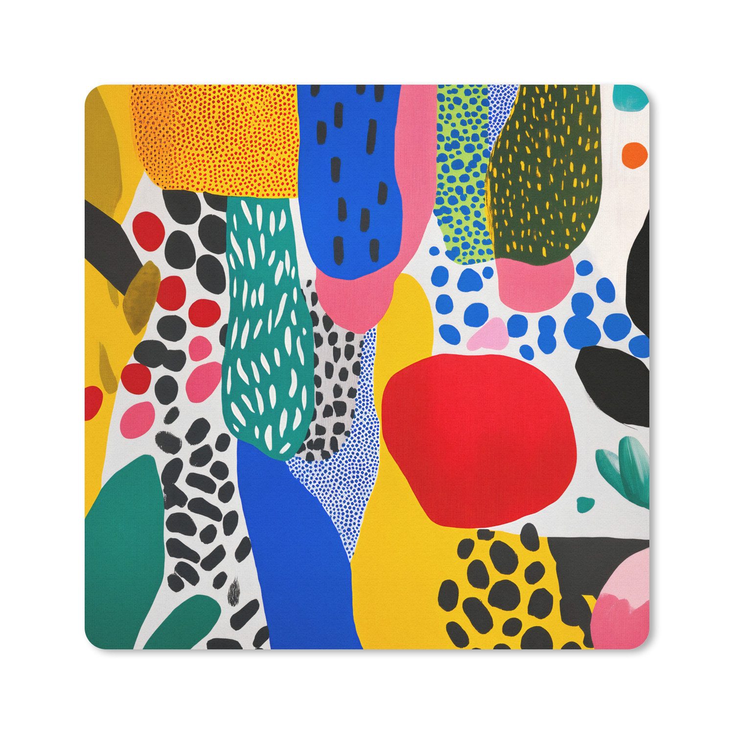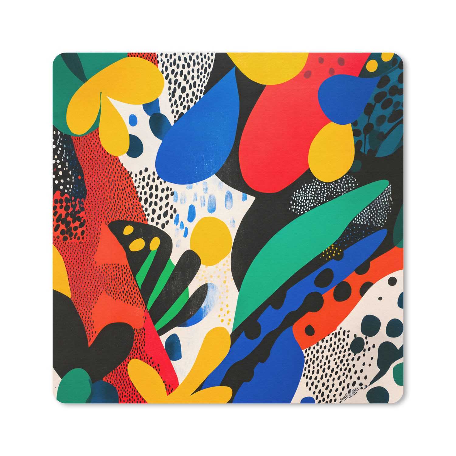 Komposition aus bunten Punkten, Pflanzen und Tupfen. Weiche und harte Konturen wechseln sich ab. Die Farbpalette besteht aus Rot, Schwarz, Weiß, Gelb und Blau.