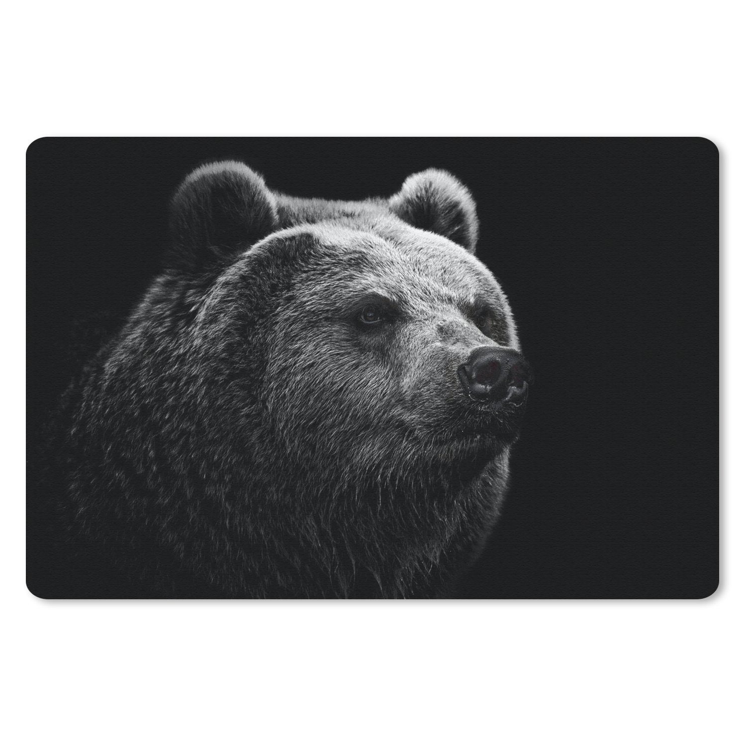 Porträt eines Bären auf schwarzem Hintergrund. Das Tier ist teilweise beleuchtet.
