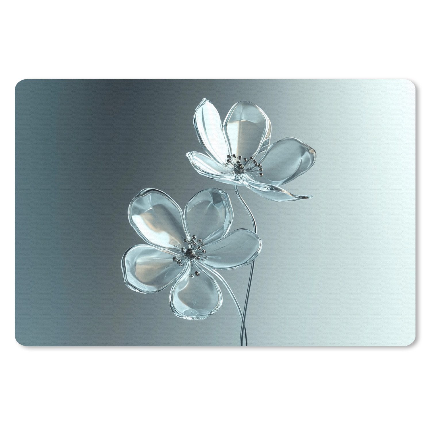 Zwei kristalline Blumen mit zarten Blütenblättern und silbernen Staubgefäßen auf einem sanften blau-grauen Hintergrund.