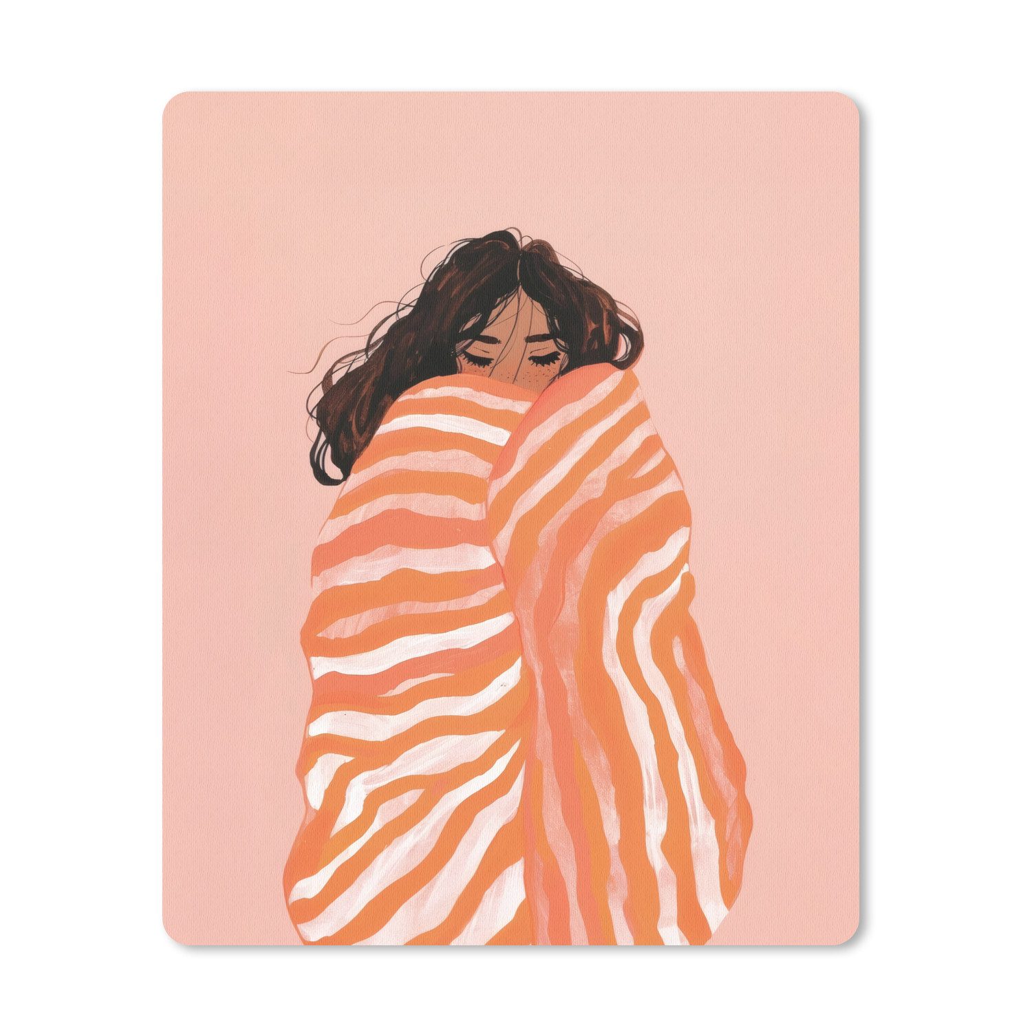 Ein Mädchen mit dunklem Haar ist bis zur Nase mit einer orange-weiß gestreiften Decke zugedeckt und hat die Augen vor einem sanften pfirsichfarbenen Hintergrund geschlossen.