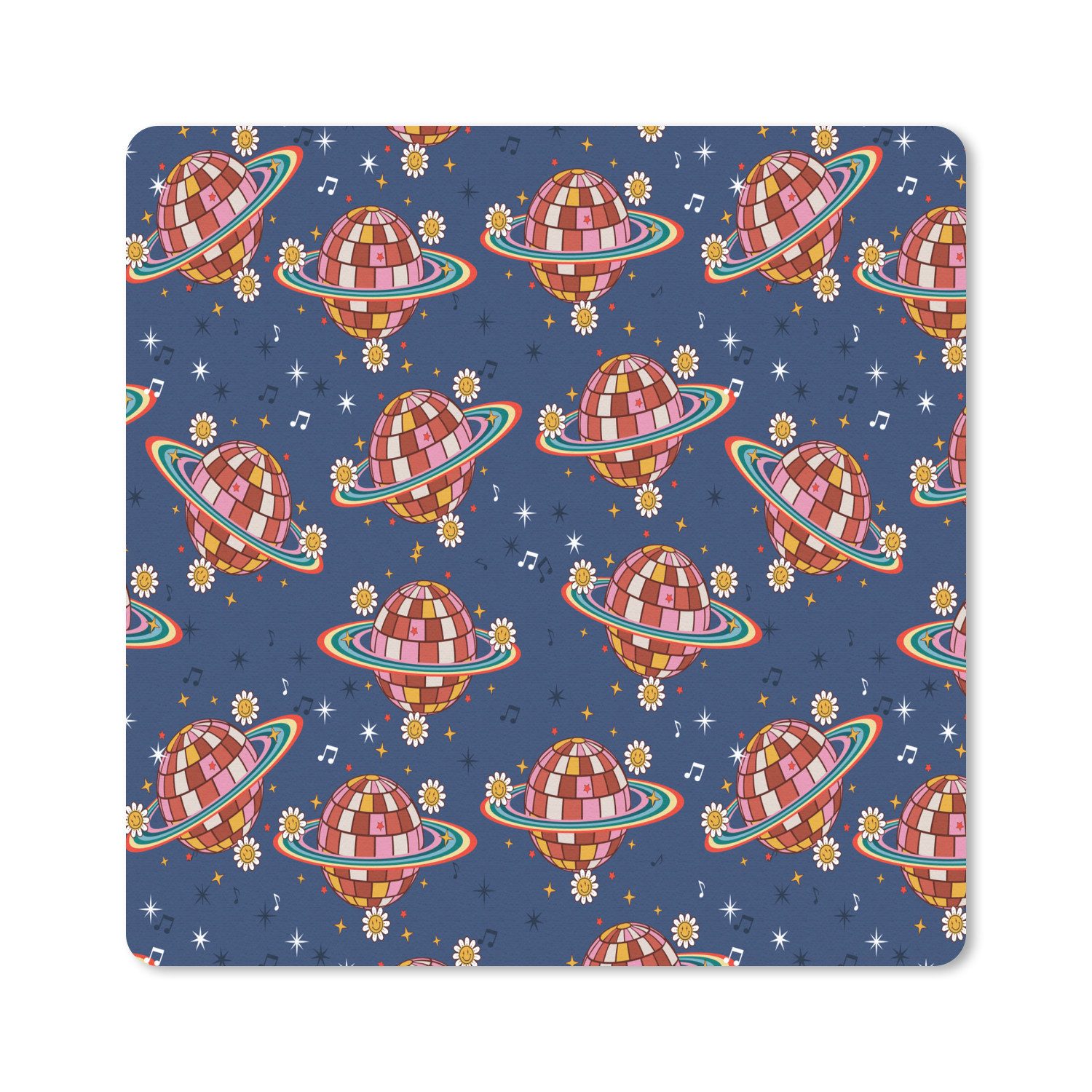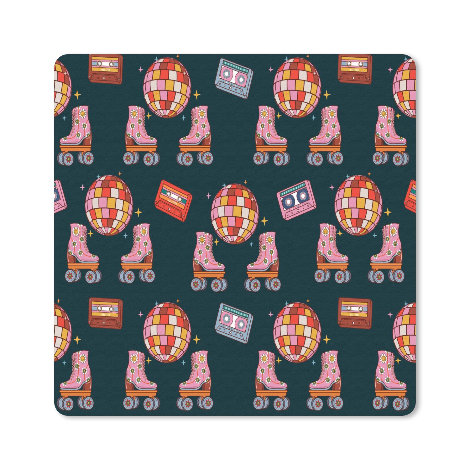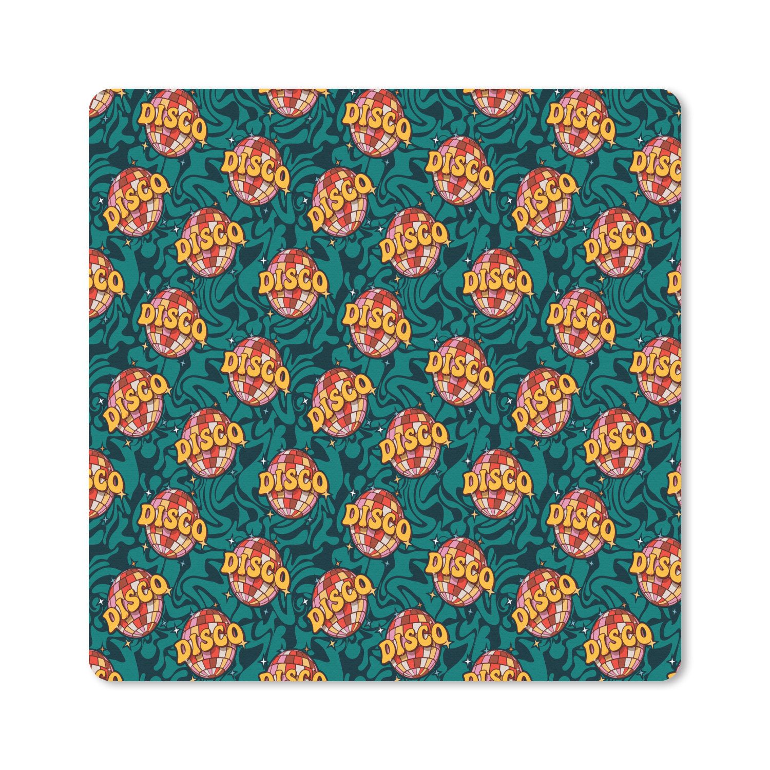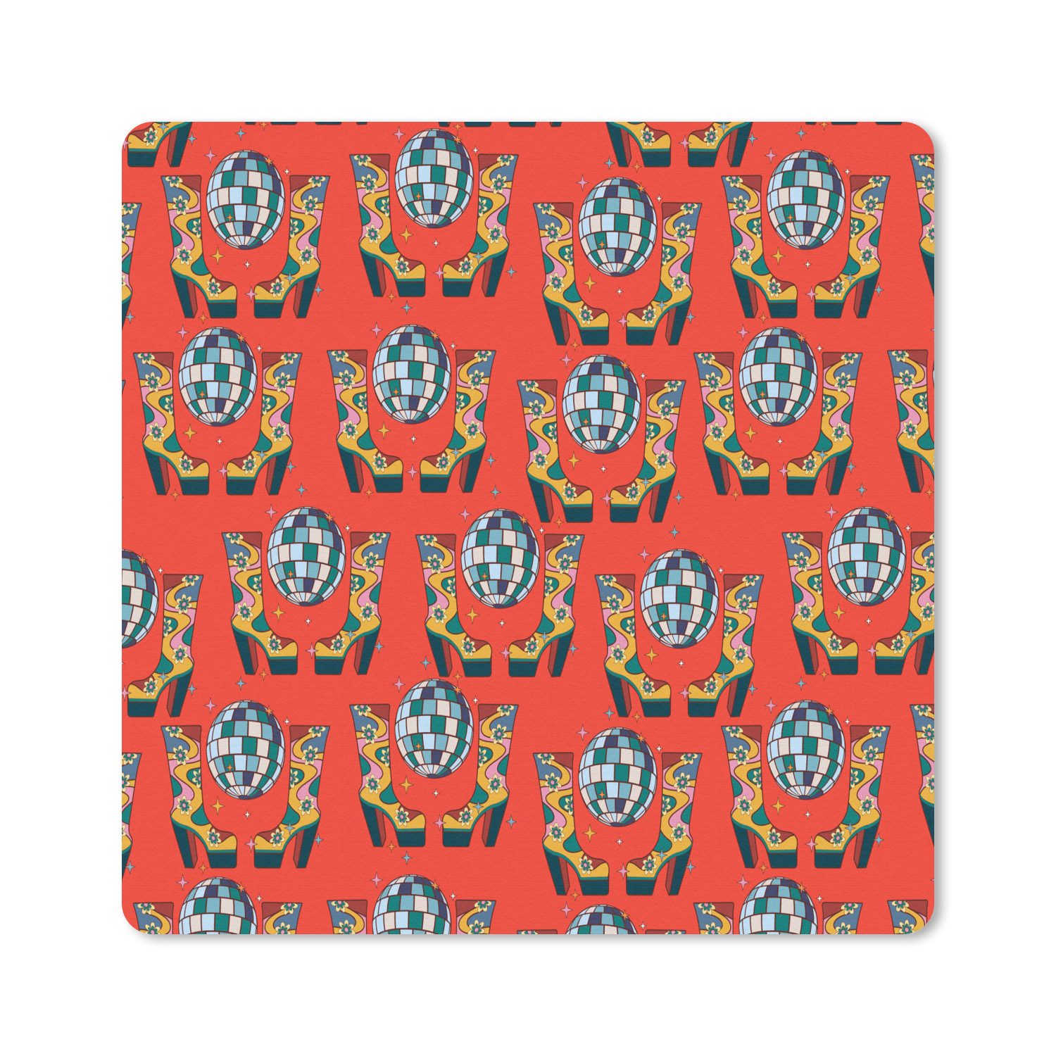 Illustrationsmuster mit lilafarbenen Plateauabsätzen, die mit Blumen und wirbelnden Linien verziert sind, durchsetzt mit reflektierenden blauen Discokugeln. Die Figuren wiederholen sich vor einem leuchtend roten Hintergrund und sind von glitzernden Sternen umgeben, was eine ausgeprägte Retro-Atmosphäre hervorruft.