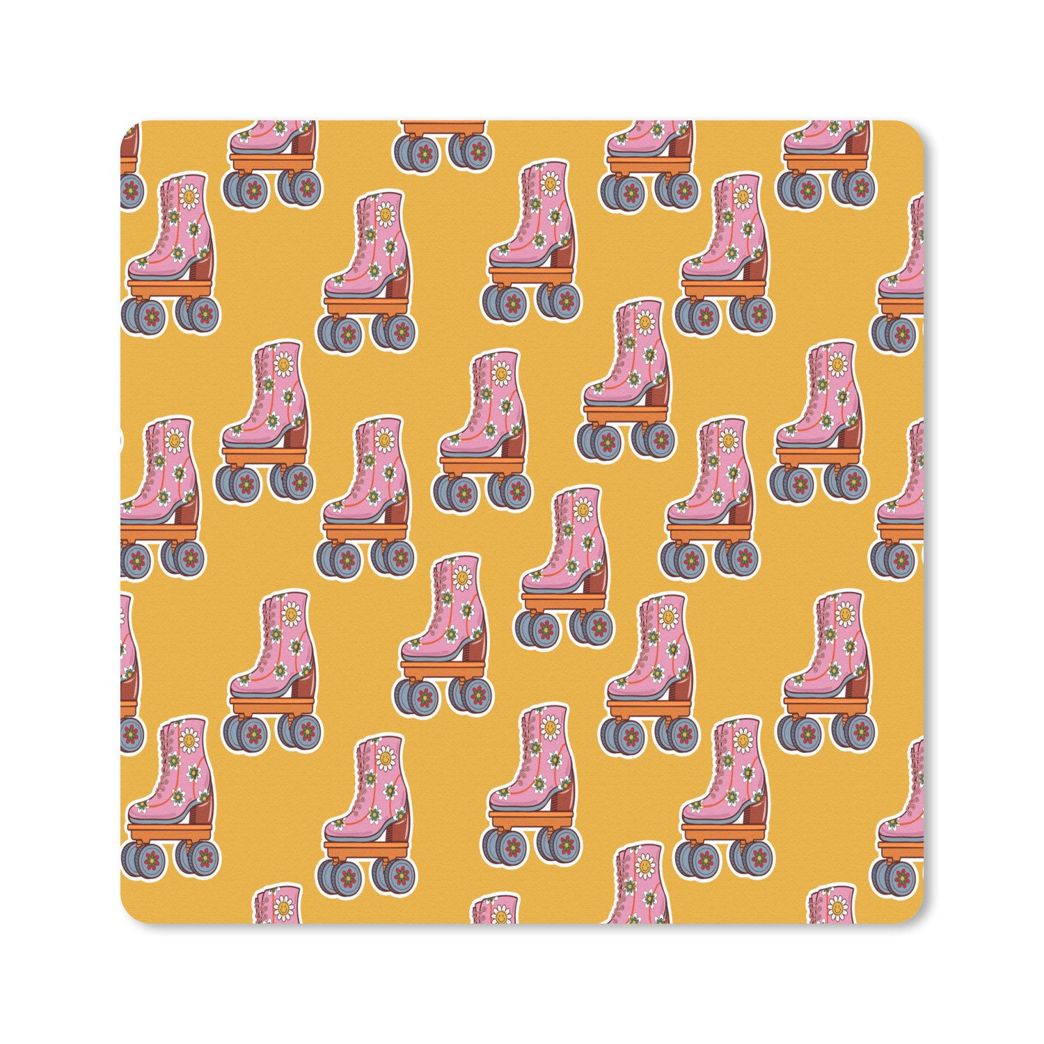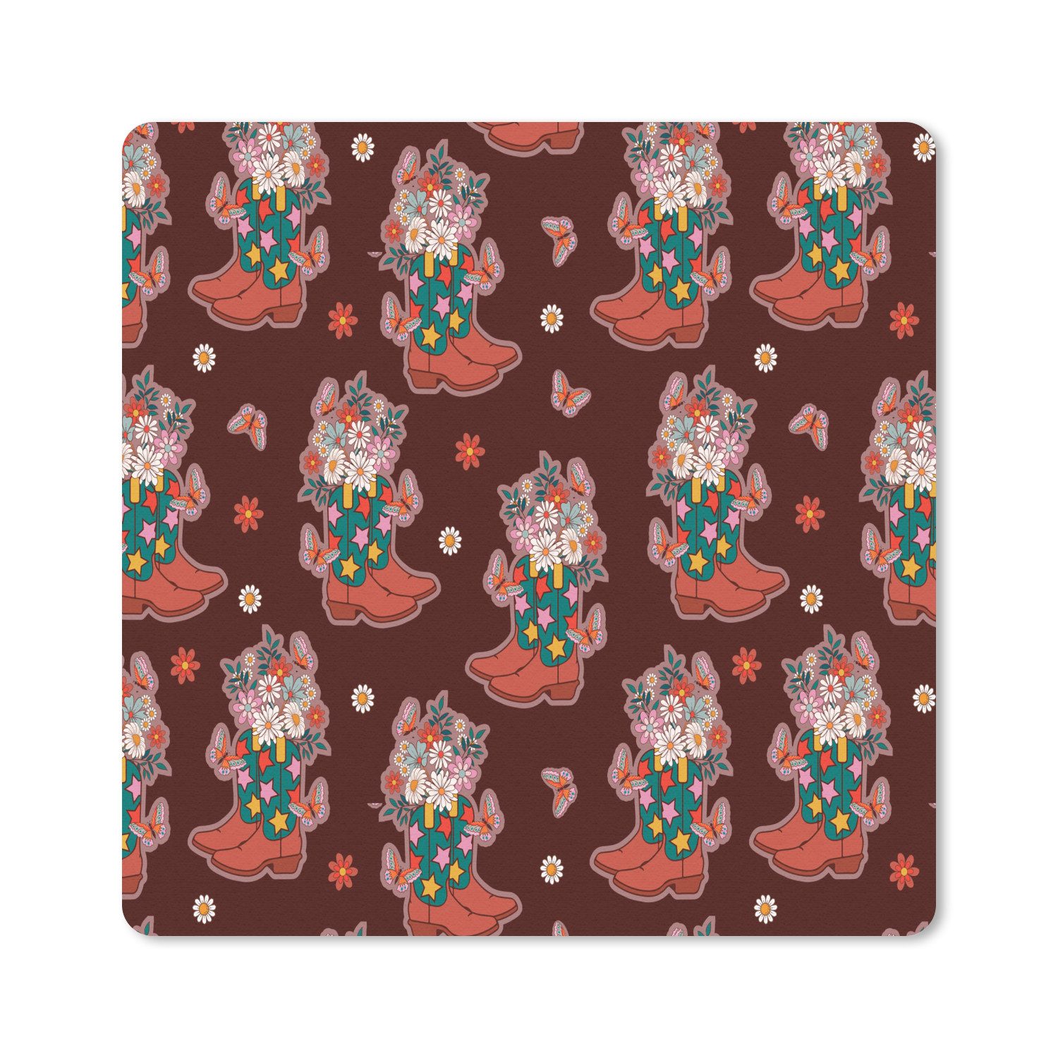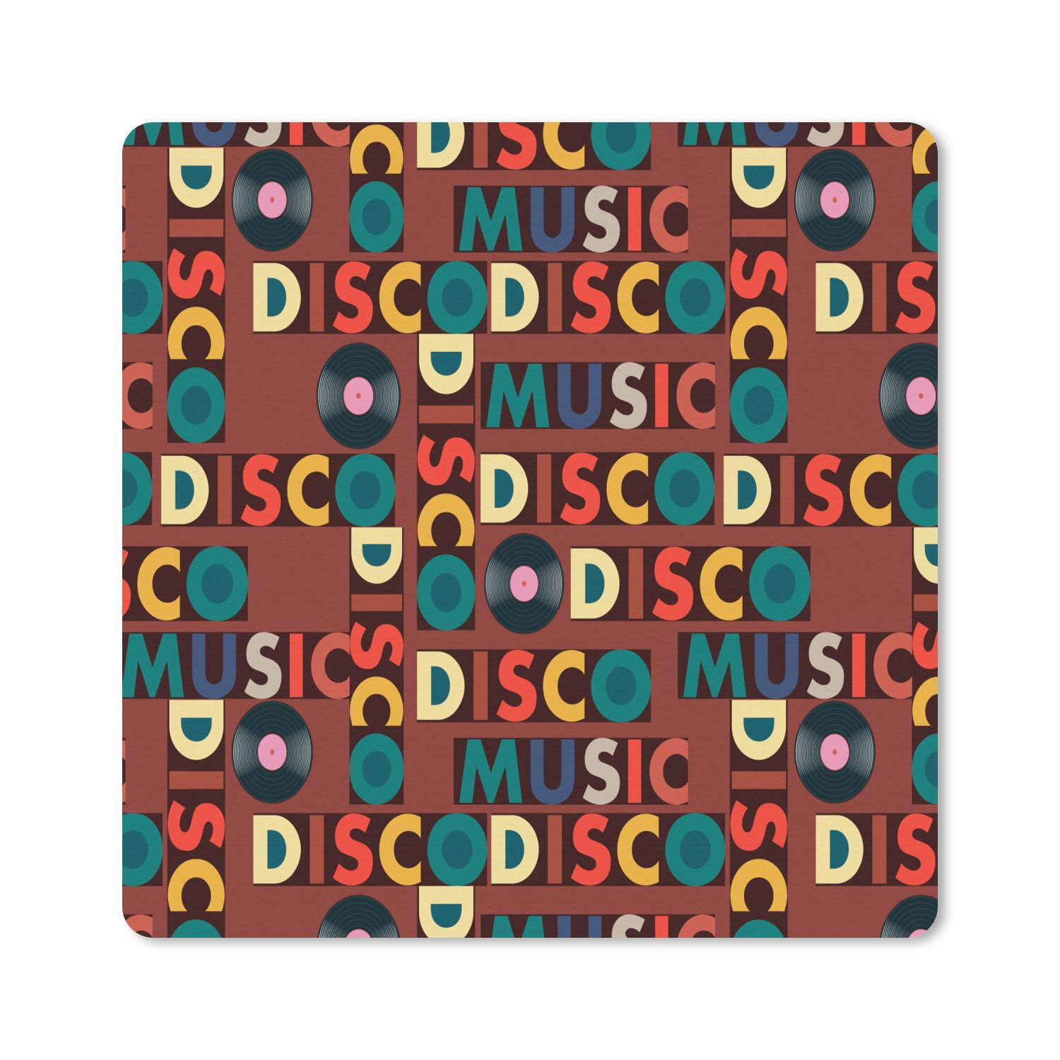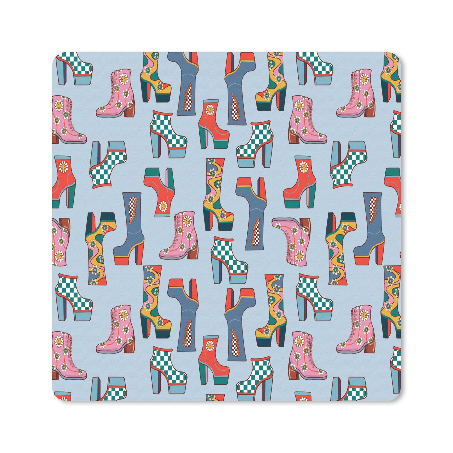 Illustrationsmuster mit lilafarbenen Plateauabsätzen, die mit Blumen und wirbelnden Linien verziert sind, durchsetzt mit reflektierenden blauen Discokugeln. Die Figuren wiederholen sich vor einem leuchtend roten Hintergrund und sind von glitzernden Sternen umgeben, was eine ausgeprägte Retro-Atmosphäre hervorruft.
