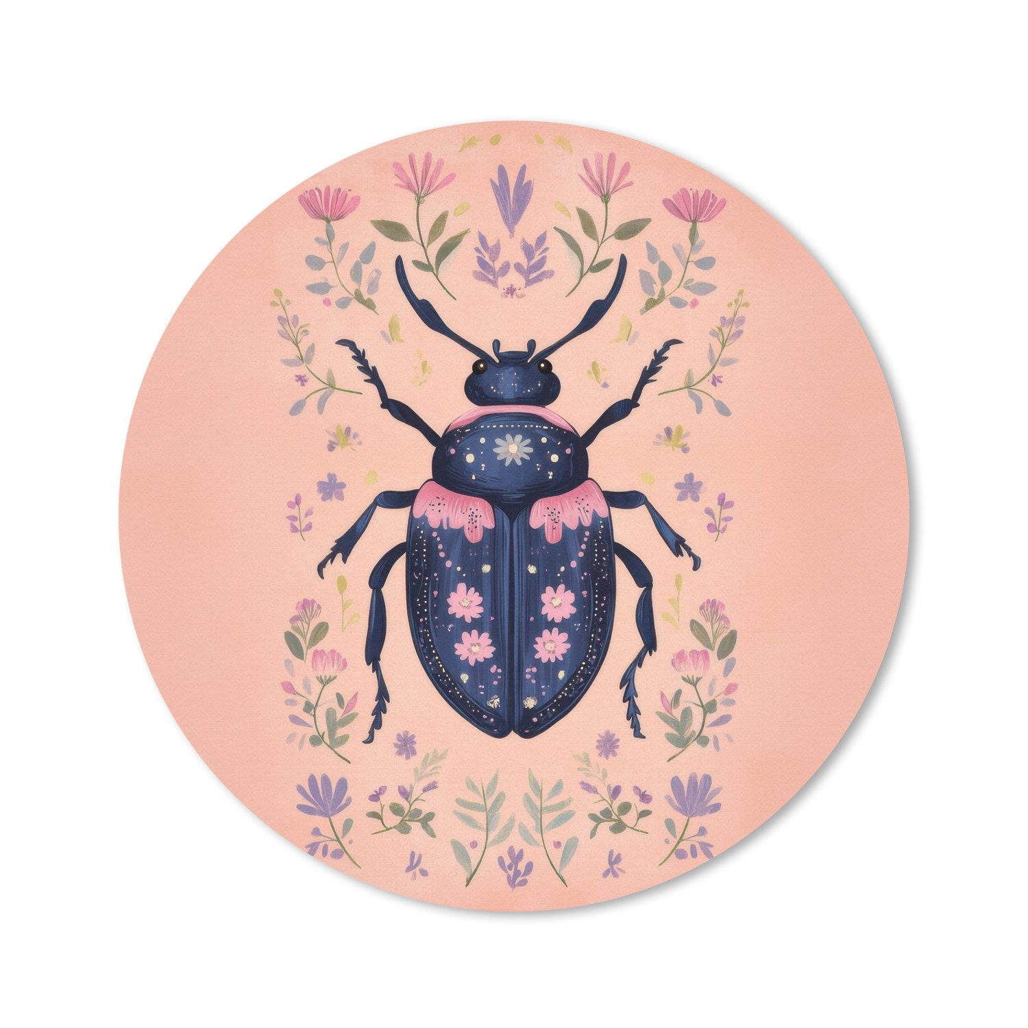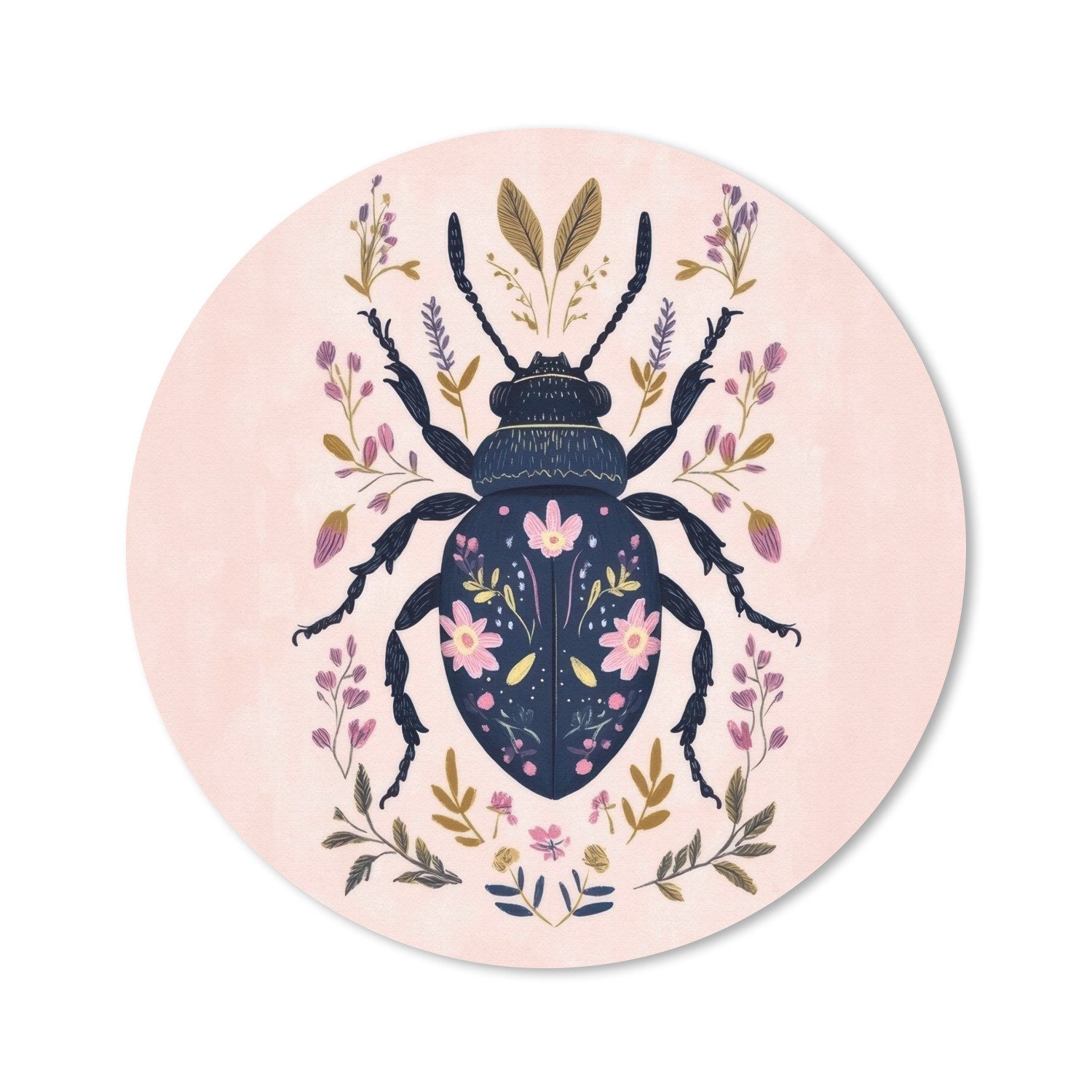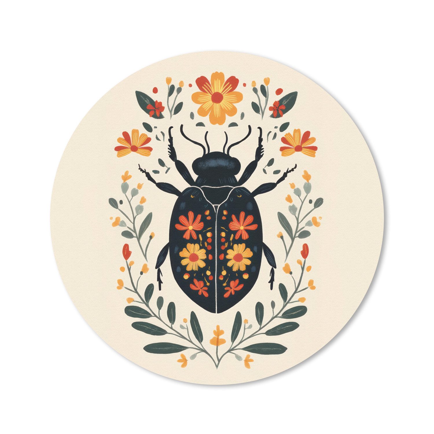 Ein schwarzer Käfer ist mit orangefarbenen Blumen verziert und von kunstvollen Pflanzenmotiven auf einem zartbeigen Hintergrund umgeben.