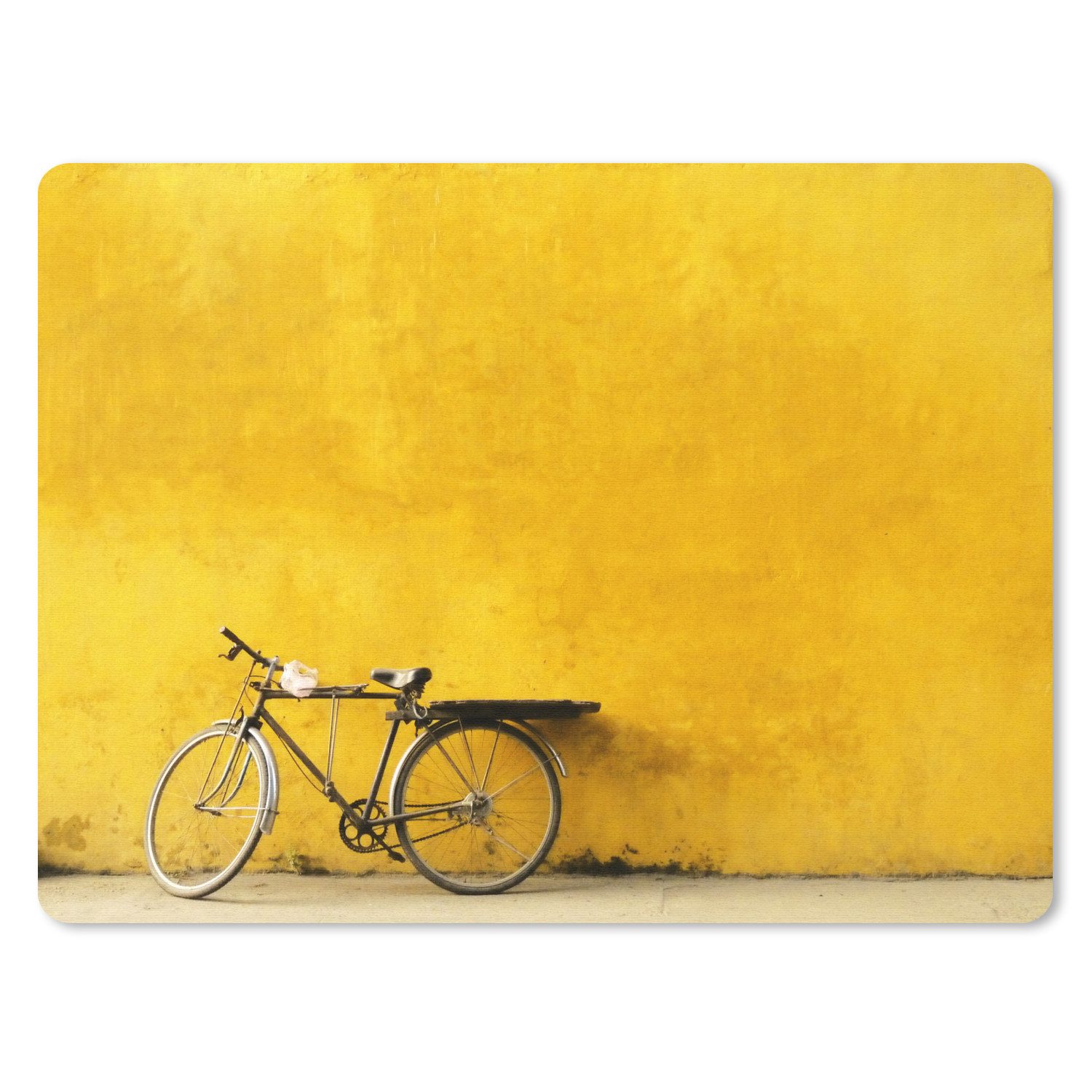 Eine Seitenansicht eines modernen und doch klassischen Fahrrads, das vor einer gelben Wand steht. Die gelbe Wand verleiht dem Bild ein sonniges Aussehen.